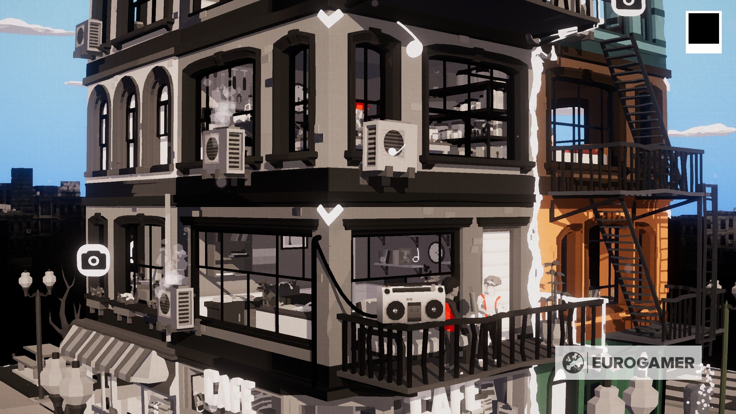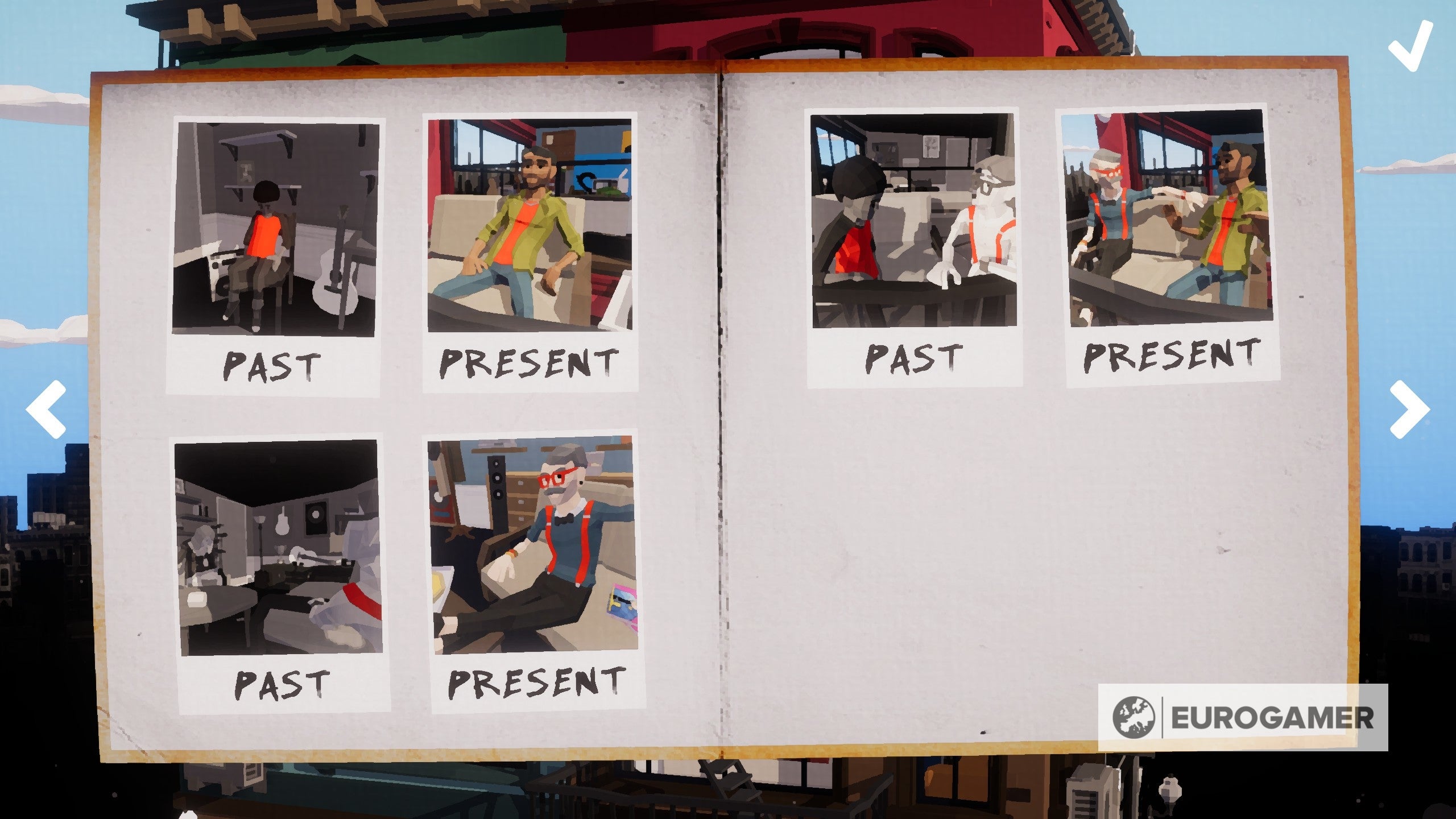 Stories are presented as photos in an album. You'll be given a picture of either someone's past or present, and your job is to fill the missing picture in. A man and woman are pictured at a dinner table in the past, for instance, what are they doing now? You find them in the building recreating the old photo, and then you spin their apartment block floor around into the present. Now, what do you see? If that alone satisfies the puzzle, the game will update with a new photo to pair to the existing one, past and present, and a part of their album page will be solved. But it won't always be that easy.