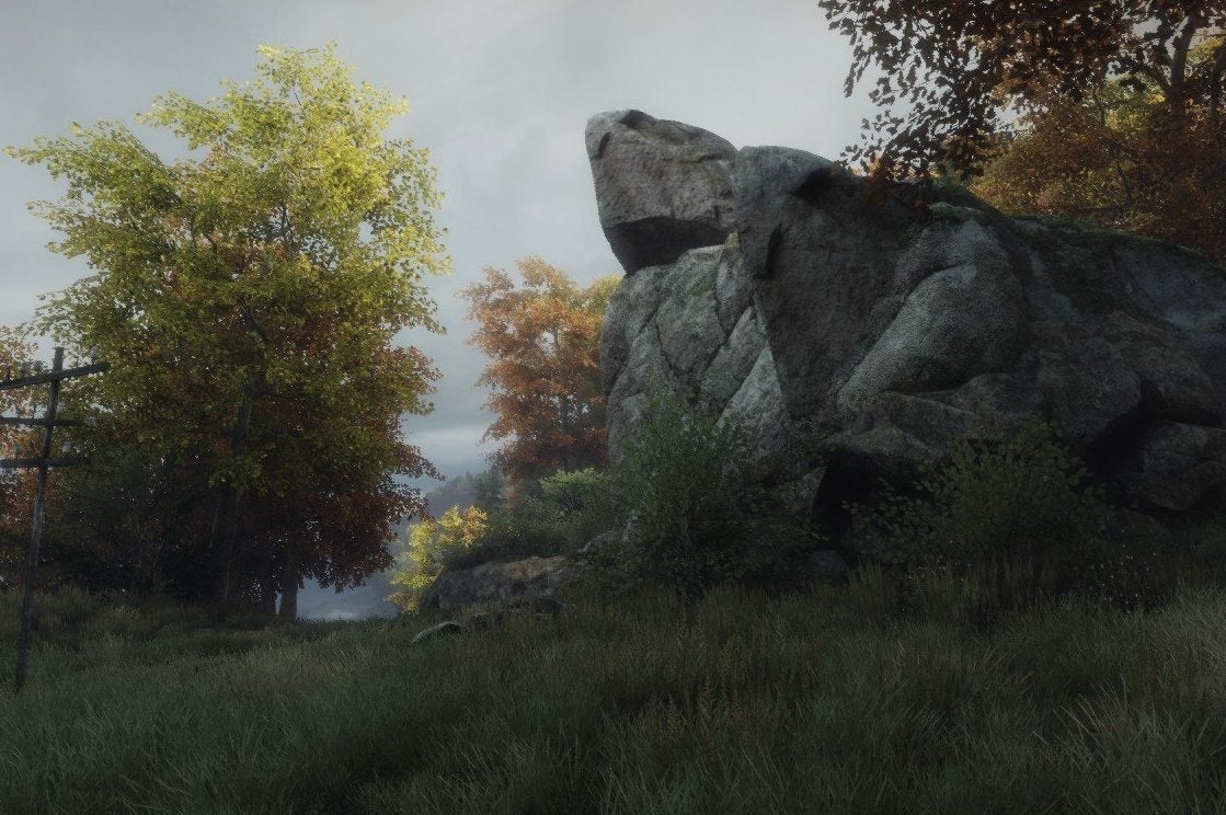Good hands indeed. There's an artfulness to the map as well as a deft understanding of the ways that players like to explore. Take the question of light, for example, as the Astronauts carve up one huge skyscape by blocking out sightlines on an ad hoc basis using nothing more tricksy than trees and hills. This allows for a single location that manages to capture a range of different times of day with no funny business that the player might spot. Walk to the left when you step away from that train track, and you get rosy dawn. Later on, distance, and some well-placed mountains, give you the gloom of early dusk. Walt Disney would be proud.