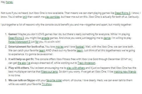 The ad then presents a pandering letter to the domineering party suggesting reasons they'll want an Xbox One too. Now certain words are highlighted green and can be changed based on a selections of other words ("slay zombies" can be switched to "race cars" or "get sweaty", for example), so users can tailor it to their specific scenario. However, the default letter reads as follows: