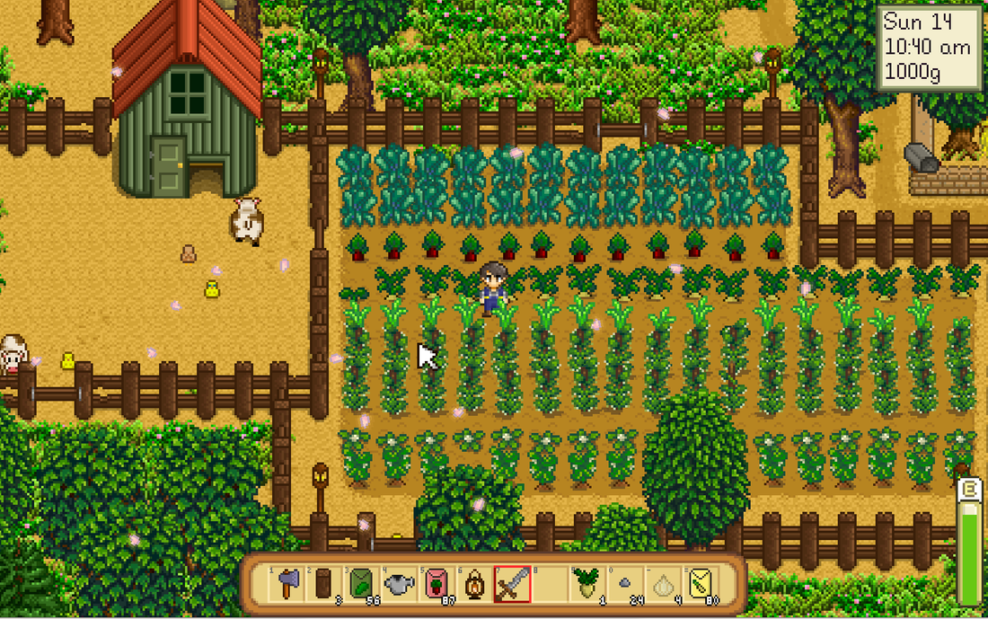 I've seen pictures of giant Stardew Valley farms, fruit trees in elegant rows and vegetables forming large acres. Minecraft buildings often feature whole sheds full of tools and raw materials, neatly sorted. It makes sense to be orderly in these games, as it does in most others, but I've never been able to do it myself.
