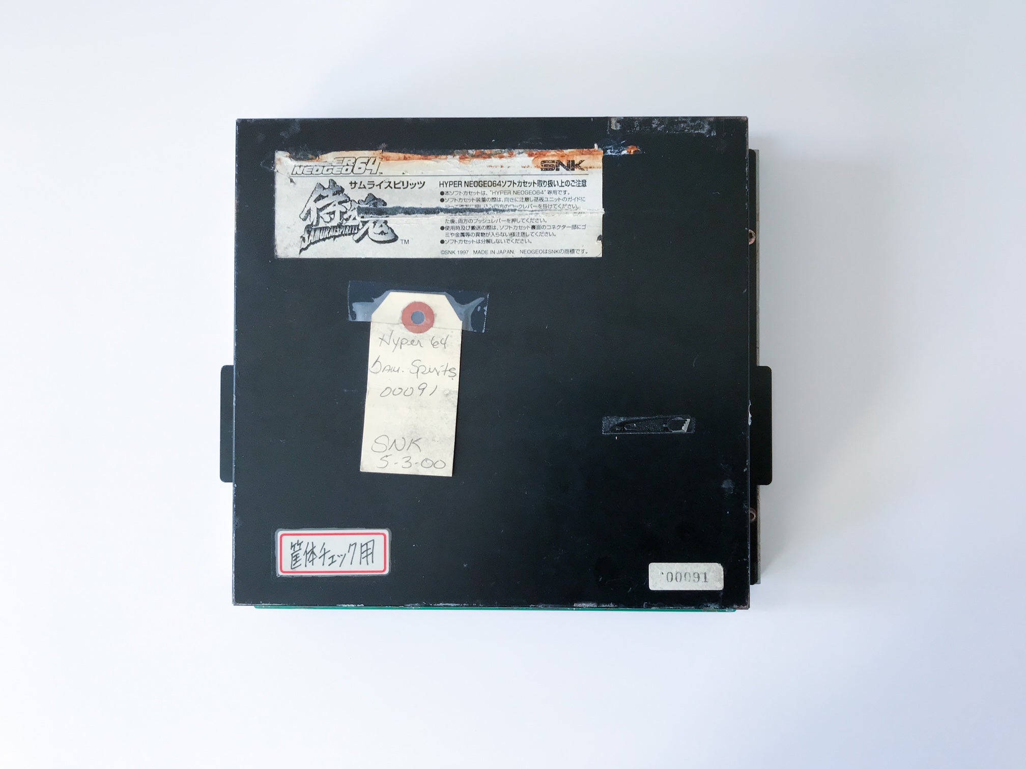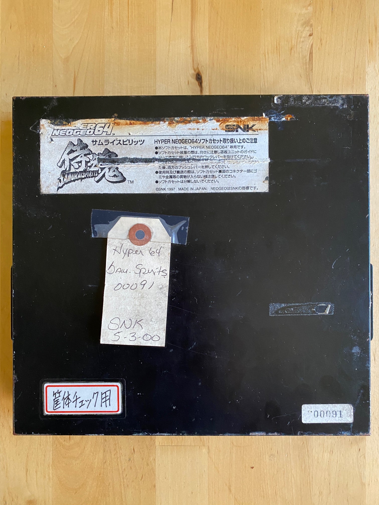 But this prototype has been sitting in a field in California under a tree for - I mean I don't know if the tree has been there for 20 years of course - but it's been outdoors. And it had rust on it. Shockingly, I was able to clean it up, and the rust wasn't that bad because it [the cart] was in the middle of the pallet. I popped it on my Hyper Neo Geo motherboard after thoroughly inspecting it, turned it on and it was the AOU spring 1997 prototype build of Samurai Shodown 64. [The AOU Amusement Expo was an annual event held in Tokyo until 2012.]