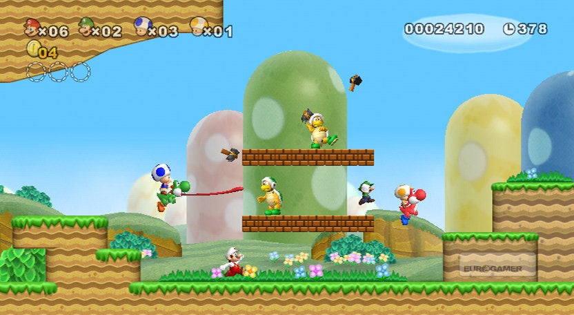One of the greatest single-player game series of all time has barely had to change at all to accommodate a wildly brilliant multiplayer mode. The camera zooms in and out to track Mario, Luigi and two Toads as they bound, scramble and bop all over the shop. Question blocks dispense as many power-ups as there are players. The level's over if all of you die, but otherwise losing a life brings you back in a bubble like Baby Mario's in Yoshi's Island, which one of your friends can pop to bring you back into the game. And... that's it. Everything else is exactly as it ever was.