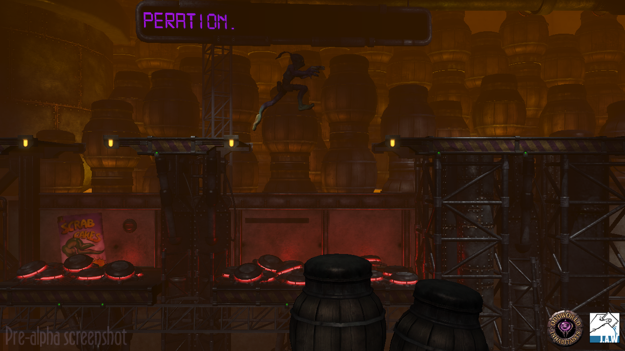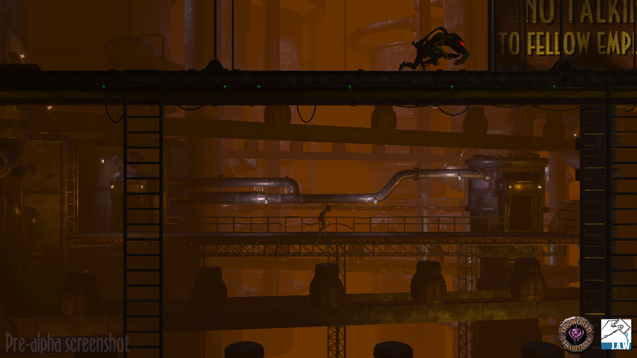 The level design and puzzles are 80-90 per cent the same as in the original. Gilray provided an example of a difference. "In the original game, the fifth screen into it, there was a sleeping Slig. When you walked into the screen he woke up. To reset it you just walked off screen and came back on screen again creeping. We don't have flip screens any more, so we've made it so he times out. Say he walks around for 10 seconds and you haven't moved, he won't have heard anything and will go back to sleep again.