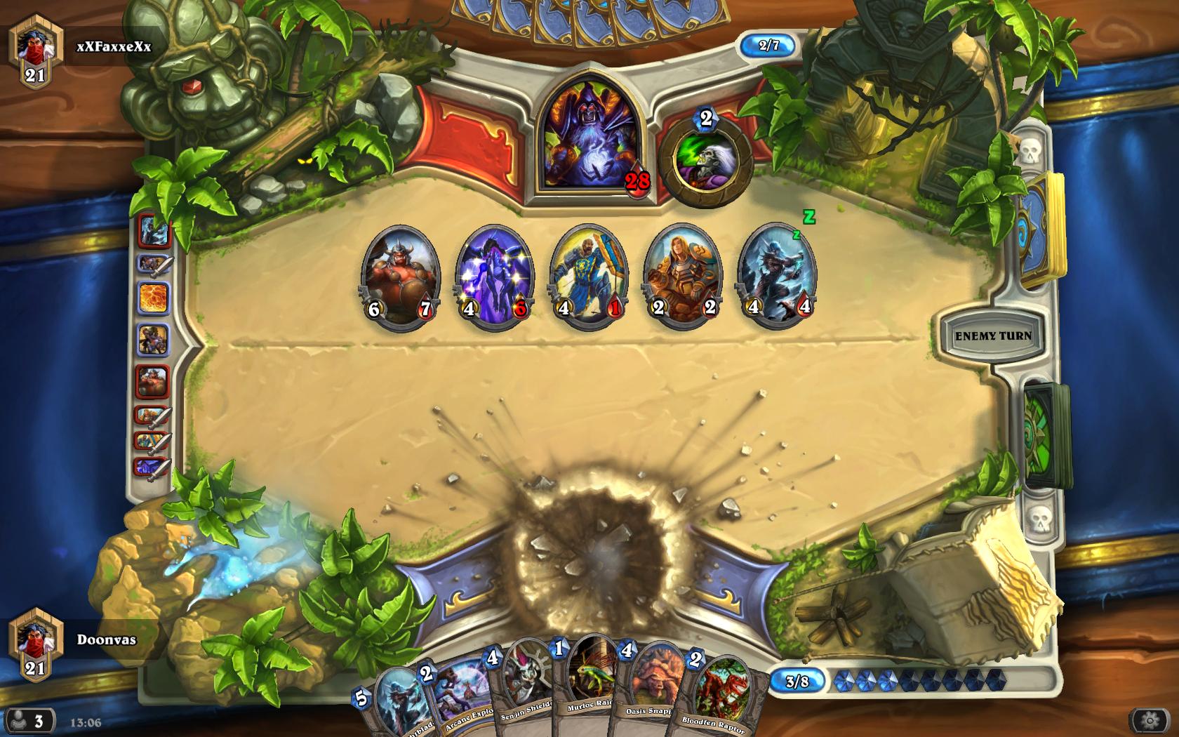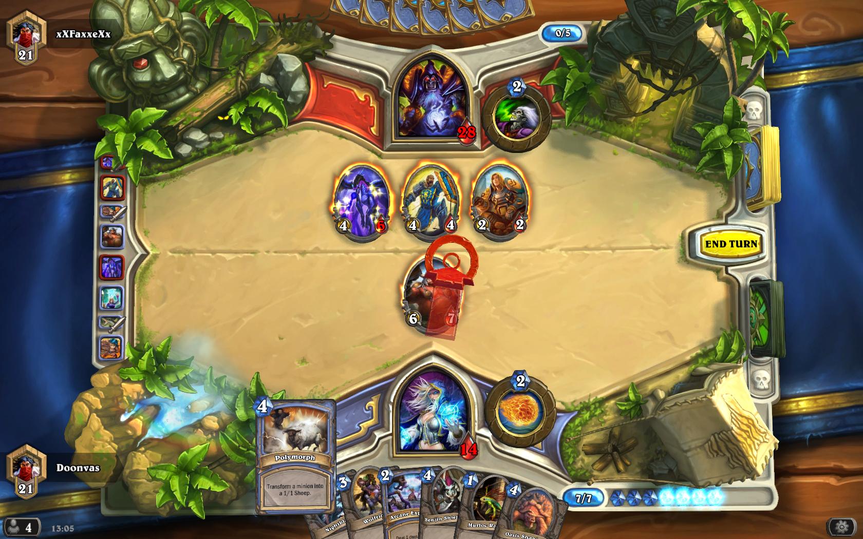 I perused my opening hand. Three cards, one of which was Arcane Explosion, a brilliantly useful card if a zoo deck gets an early rush on you, since you do one damage to all enemy minions. I'll kill that guy straight off, I thought to myself, and I received the far more harmless Murloc Raider in its place. Not bad. Also, I had Polymorph. That would be great to use on any big minions I happened to summon. With a hand like this, I probably wouldn't even see me coming!