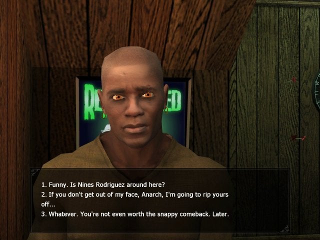 Its most noticeable Deus-Exism is a shared belief in allowing multiple solutions to problems, based on your characters' abilities and your chosen approach. While not quite as variable, you'll find it possible to wander between the two poles of current action gaming - that is action and stealth - as well as a selection of others. Hacking (through a cute typing interface) and lockpicking are obvious, but Vampire stresses direct communication more than most games, up to the point of having separate skills for persuasion, intimidation, seduction and haggle. With a high rating in each, conversation options open up for the player to use. For example, I found myself gleefully playing a femme fatale for the majority of the game, which was immensely rewarding. Personalising any game in ways like this is powerful - when presented with a building full of enemies and a boss to assassinate, some will find kicking down the door and offing everyone amusing, others will prefer playing the ninja, and yet more will opt for talking past the doorman and then flirting with the leader enough to send away their guards. Also, like Planescape Torment, conversation options will alter depending upon your statistics and even your clan. For example, if you play the insane Malkavians all your character's options are altered to enigmatic pseudo-prophetic schizo-tongued gibberish (As a hypothetical example, while a more sober clan may say "I'm looking for a firearm," a Malkavian would mumble out "Cordite sticks and iron-fire I seek for the bang-bangs." Er... except competently written, y'know.)