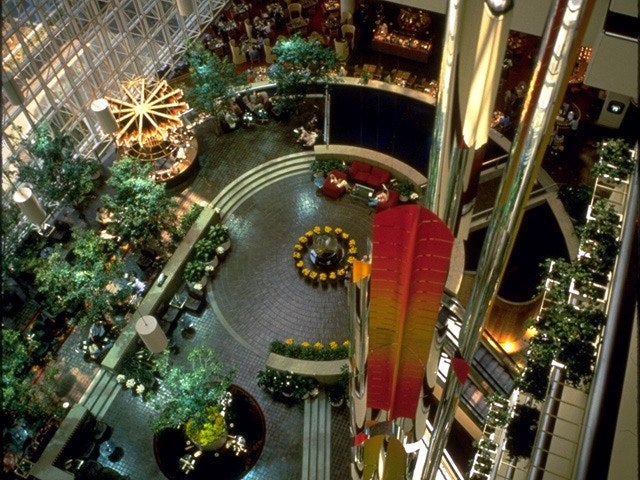 My room is on the eleventh floor of the hotel, and as you walk out the door you find yourself on a balcony that overlooks the hotel's "atrium" ten floors below, with another ten floors visible above you. Looks great, but not recommended if you suffer from vertigo...