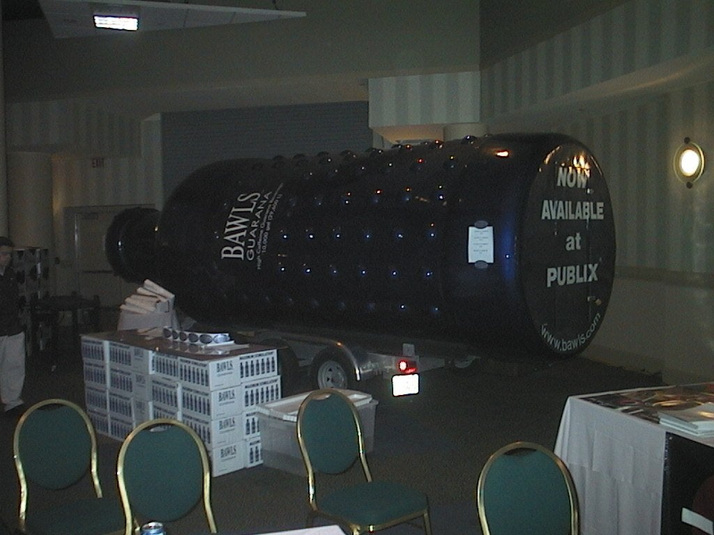 The event is being held in a big underground hall here at the Hyatt, with row after row of tables covered with computers filling the main area. Further back and around the sides there are stands for Razer and several other companies, including a giant Bawls bottle! Mmm .. caffeine.
