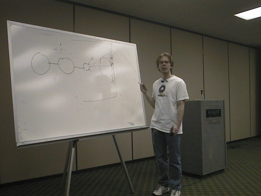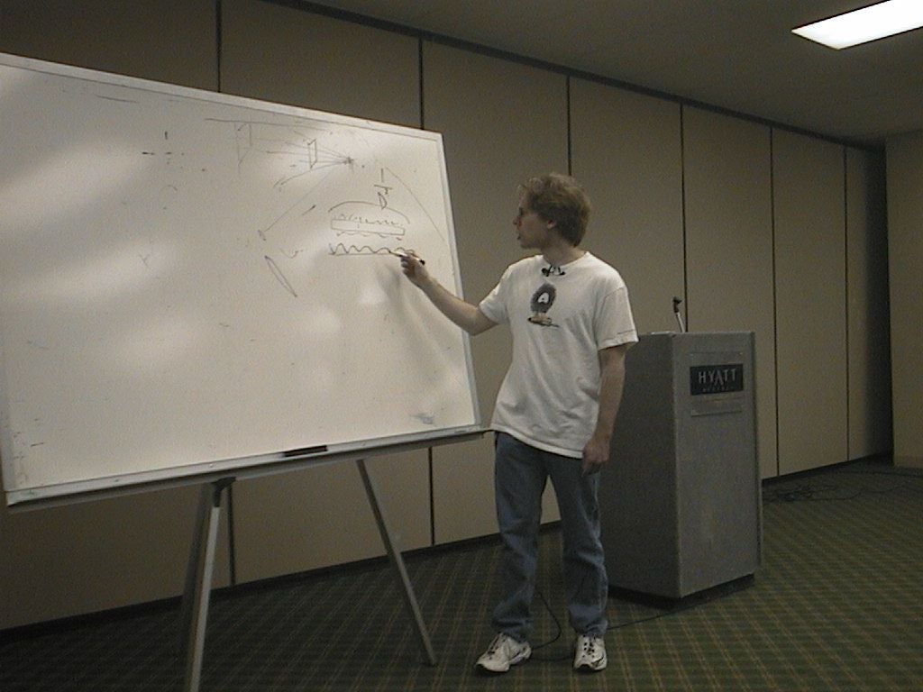 When John did arrive his talk was rather technical to say the least. Katherine's version had been "Graphics cards are cool, buy Quake 3!", but John's speech wandered off into the way data is passed from your eye to your brain (apparently with all the bandwidth of an analogue modem), the way we perceive things, and the physics of lighting. As a former physicist myself I was in a better position to understand it than most people in the room, but it was still pretty baffling in places, and splattered with buzz words and technical jargon!