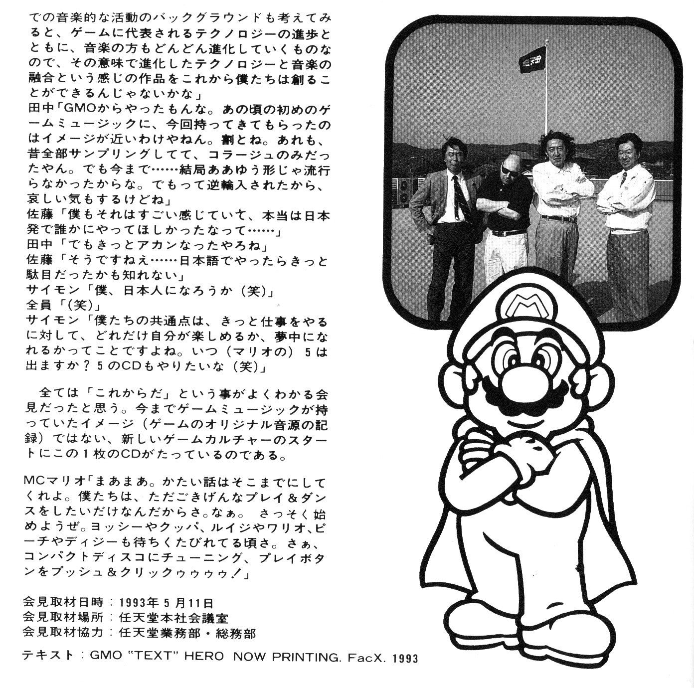 "However, we got a great response from a label in Japan, called Alfa Records. They were very enthusiastic. The guy there was called Hiro Masakazu, and he had a friend who worked at Game Freak, who in turn knew the Nintendo people in Kyoto. So, we went to Japan to discuss making an album - which I ended up making, of course - and actually went to Nintendo's Kyoto HQ to ask permission."