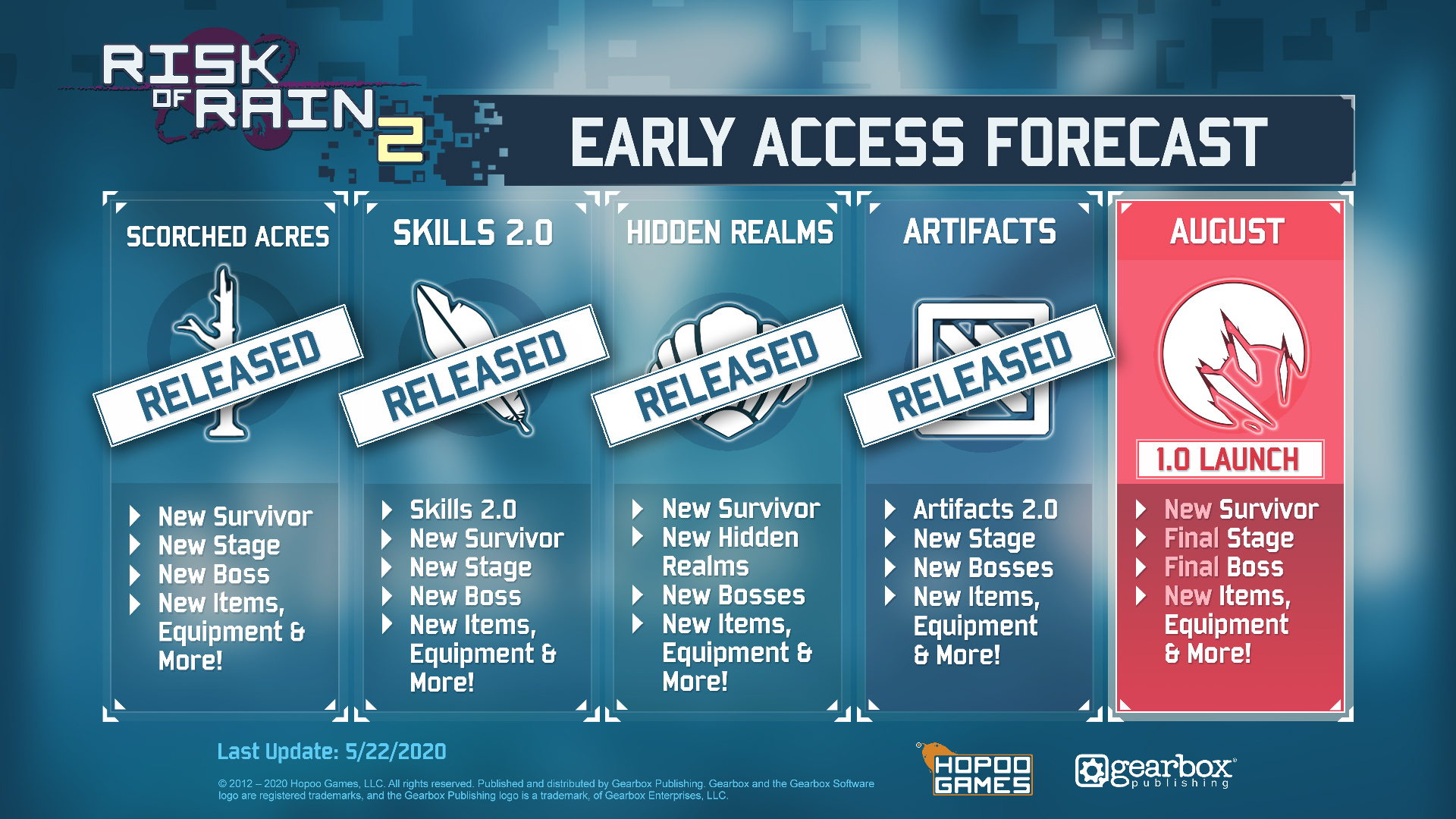 Hopoo says moving Version 1.0's launch from spring to August - the first deviation from its roadmap since early access began - will enable it to "make sure RoR2 1.0 [is] truly a complete game experience, and that means not only completing and fleshing out content, but improving and iterating on old features and content that's been left behind."