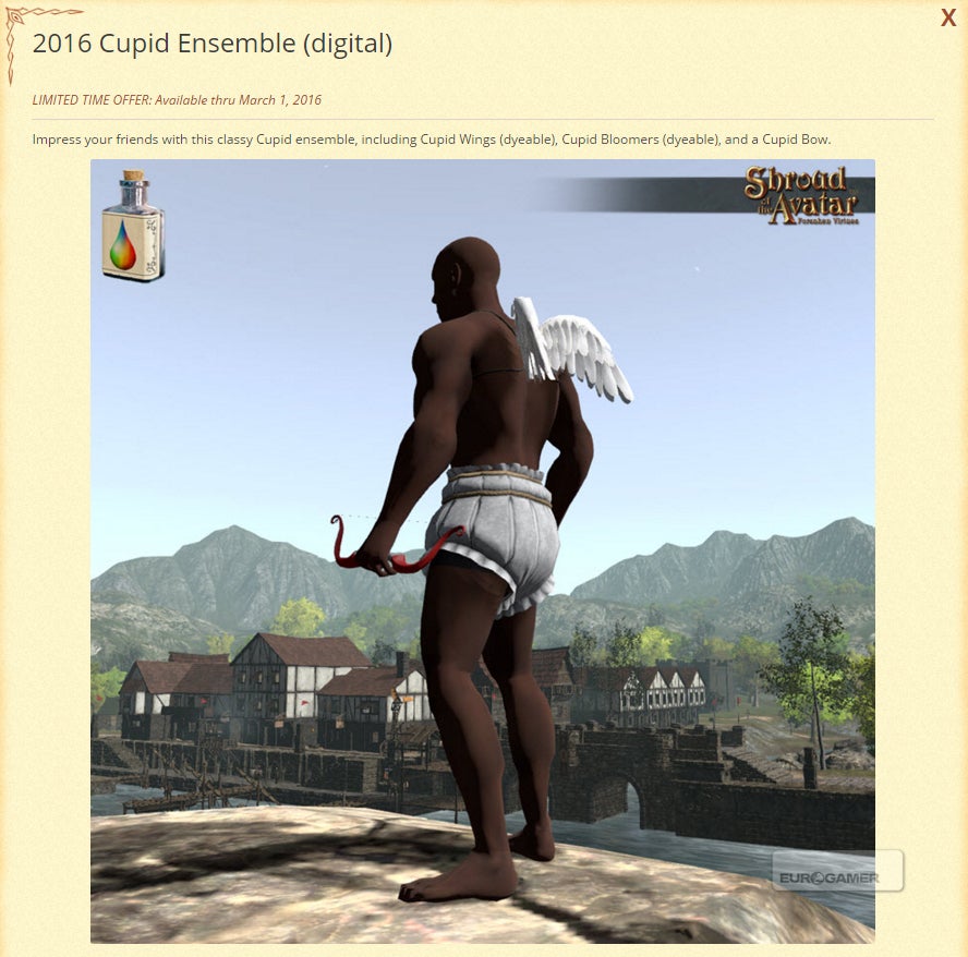 He's asking for hundreds, even thousands of dollars from you in return for real estate in his new game Shroud of the Avatar. And it's working. Shroud of the Avatar has become the second highest-earning crowdfunded game behind Star Citizen, with a huge portion of its income - $6m of $8m so far - attributable to the game's online Add-On Store, which is dominated by all things real estate: deeds to land, houses themselves, bushes, shrubbery, decorations, statues. You can buy a $10 Wooden Outhouse, a $10 Ornate Tile Hot Tub (on offer, reduced from $15!), or a $150 Druid Town House that looks like a home carved out of a gnarled old tree. You can buy some cupid pants and wings in time for Valentine's Day. The Shroud of the Avatar Add-On Store is like an expensive medieval Sims catalogue.