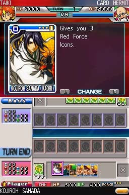 Problematically, the special moves that some cards can trigger (by using the Force gems) are incorrectly assigned on many cards so that the actual effect often isn't what you're told it will be. Also, at the start of each game, you must roll a dice to decide which player goes first and, as Playmore has butchered SNK's masterful game balance, going first is a gigantic advantage that in most cases will pave the road to swift victory. At least, it would if the AI knew how to play its own game. Frequently, the DS will hold back (or fail to notice) moves that could finish you off and so, besides being a chore, the game's just too easy in the main.