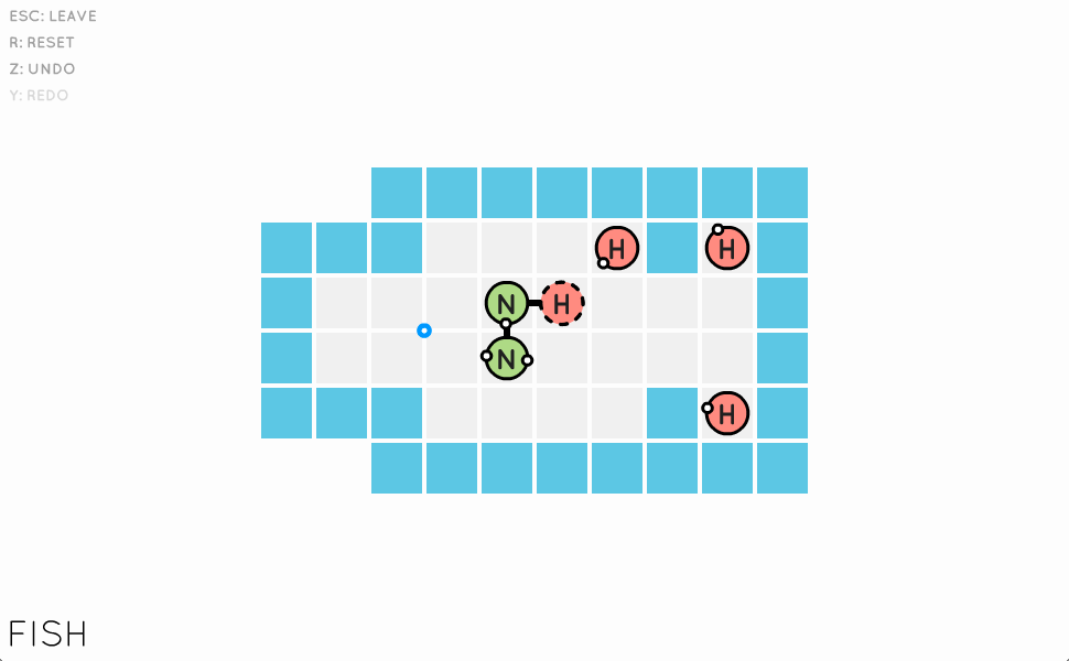 I love the way that each level involves different tiers of thinking; truth be told, I kind of hate sliding puzzle games because I find them so samey and strict. But Sokobond levels are fluid. Maybe you'll try to visualise the formation you need to produce before you work out how to make it: one level called Chimney has a single-bonded hydrogen atom placed right up the end of a narrow alley, so you know you need to form a rod with the other atoms to access it. Sometimes you'll experiment first and see if the formation makes itself evident. Either way, you get that lovely sense of steadily evolving comprehension as you feel out where the challenges are and strip down the possibility space, bringing what initially seems impossibly complex under control. Sokobond's chemistry is organic in the best kind of way.