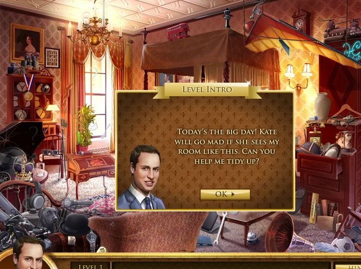 A hilarious platforming adventure where you must sneak aboard the royal train to meet your mistress the night before marrying your ex-girlfriend's 19-year-old sister. Oh no, that is of course the 1983 Spectrum version of Royal Wedding. This one is a modern-day hidden object game, in as much as any hidden object game can be considered modern.