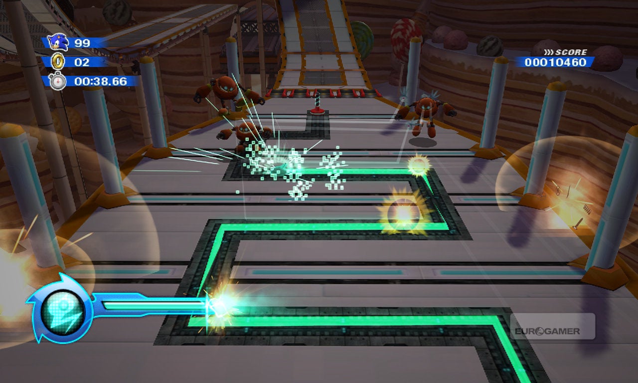 The level begins and Sonic hurtles out of an airlock, down a twisting, loop-de-looping pathway into the heart of a star fleet, and it's a marvel to behold. Colossal rainbow-coloured ships wheel and turn while the pathway loops manically around them and you bullet along at breakneck speed. It's a riot of neon signage and lambent, Escher-like design, drunk on fizzing, synth-tinged J-Pop. It's stupefyingly fast and utterly thrilling.