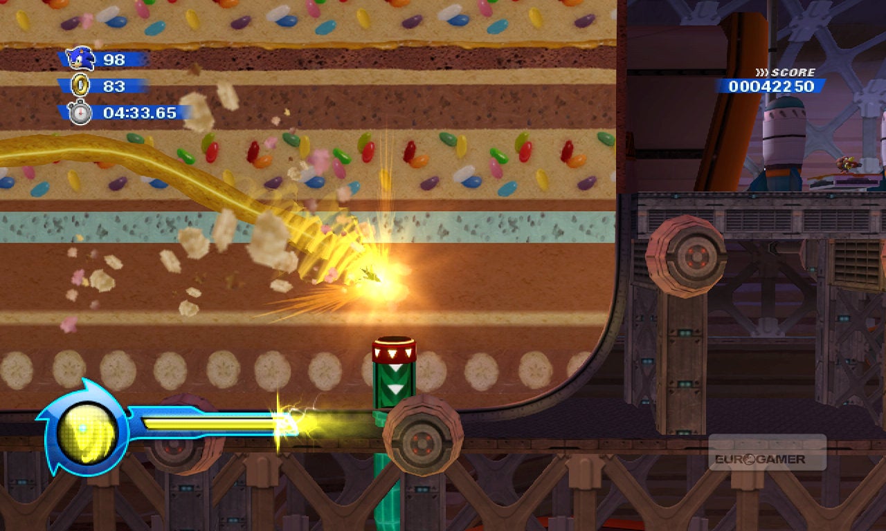 Step away from the hub into one of the game's seven areas and you're presented with a sequential series of levels themed around that particular area. Starlight Carnival's levels, for instance, are set in space and aboard ships; Tropical Resort is all palm trees and sand; and Sweet Factory is composed entirely of cake and candy. In a nod to the past, the Game World zone is a non-critical side-area which is unlocked from the start and features old-style side-scrolling levels complete with 8-bit menu music.
