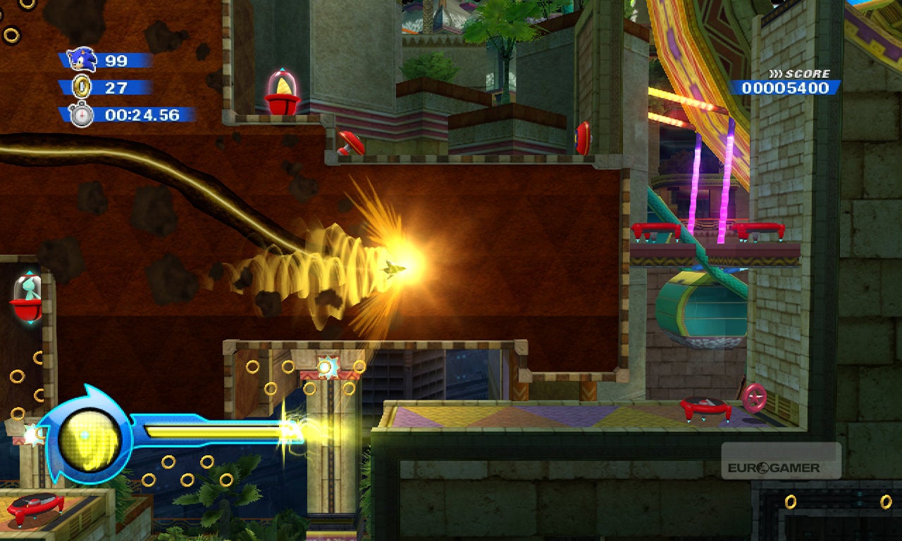 It's the wisps that put the colour into Sonic Colours. In each of the main areas you'll free captured wisps, at which point you become infused with their powers. Blue wisps turn Sonic into a lightning bolt, which enables him to zap through large sections of a level and access otherwise-hidden pathways. White wisps endow Sonic with turbo energy for mind-blowing speed. Each area you unlock has its own wisp type, which brings variety, and often a measure of exploration, to the zone.