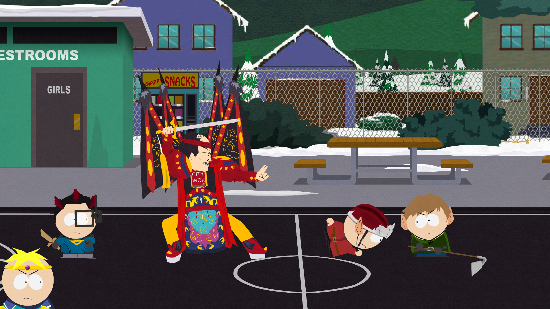The story starts from a typically mundane place - you're playing a new kid in the neighbourhood who gets roped into Cartman's fantasy war against a rival gang of kids pretending to be Drow Elves - but quickly splinters off into all kinds of ridiculous tangents. Pretty much every South Park character of note gets to appear, sometimes in a cameo, often in a way that is genuinely surprising - and it is, at all times, gut-bustingly hilarious in all the worst ways.