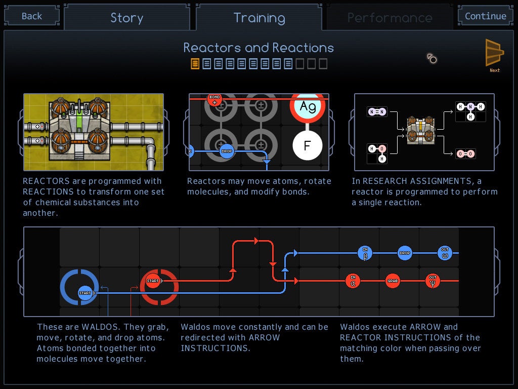 The root problem of each stage in SpaceChem is to design a "reactor" that will refine raw atoms and/or molecules into a new compound. Your reactor might be connected to an atmospheric pump that provides you with a 3:1 ratio of hydrogen and nitrogen atoms, and the goal is to cobble these together into – yup, you guessed it – ammonia fuel.