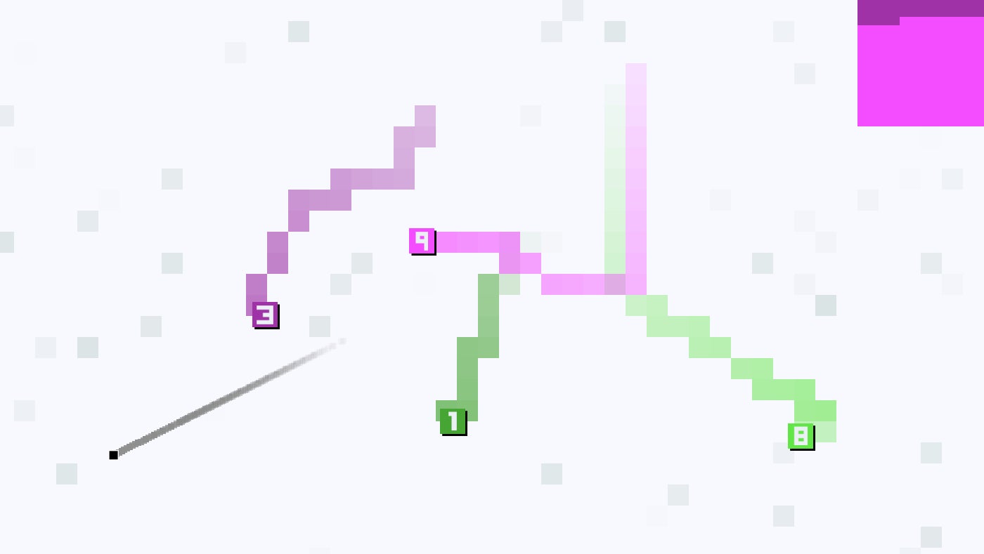 Hokra, the last of the bunch, is a highlight, and it's here that the jostling, frantic nature flowing through Sportsfriends is at its most pure. The starkness of the aesthetic helps - told with clean, substantial pixels, it looks like it's running on an Atari 2600 raised in the design schools of Scandinavia - as does the simplicity of its purpose, mixing King of the Hill with the physicality and crackling kinetics of hockey. Playable by four players split across two teams - and playable by four players only - the aim is to knock a puck into one of your own zones, slowly charging it until it's completely yours. Matches are then about teamwork and escalating drama, with different maps - and a reasonably useful level editor - adding ripples through the play.