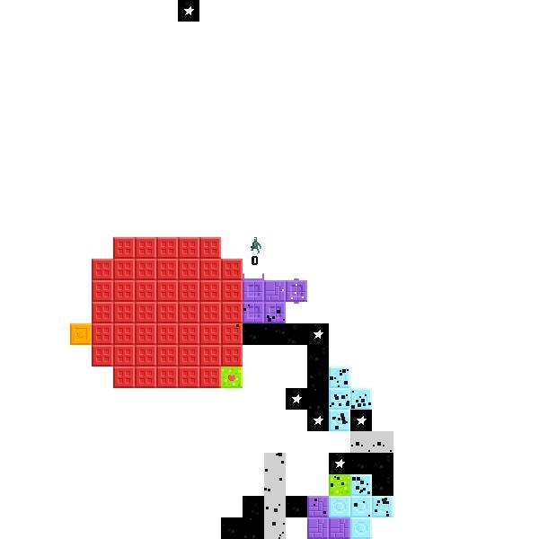 Through here is where you can start planting starseeds and experimenting. The pilgrim's controls are child's play: arrow keys for movement, up to jump, space to plant a seed and double-tap to tunnel sideways or down. You begin these areas atop a large pile of grey bricks which are gradually being swallowed at the lower end by the influence of a star; the brightly-coloured starseeds let you grow out and away from the corrupting blackness, though you'll never quite escape it.