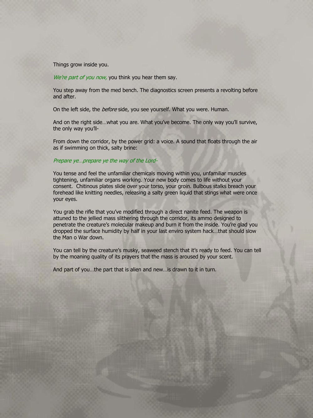 During the first half of 2006, Hellquist wrote an outline script for each area in the game that Levine could work from when he came to write the first draft of the dialogue. Hellquist had the idea of making the control a spoken phrase. Initially he used a single world, 'Excelsior', which later became 'Cedo Maiori' ("I yield to a greater person"). But these phrases too obviously signalled Atlas's treachery. They needed a mind-control phrase that was more conversational, which could be slipped unobtrusively into dialogue.