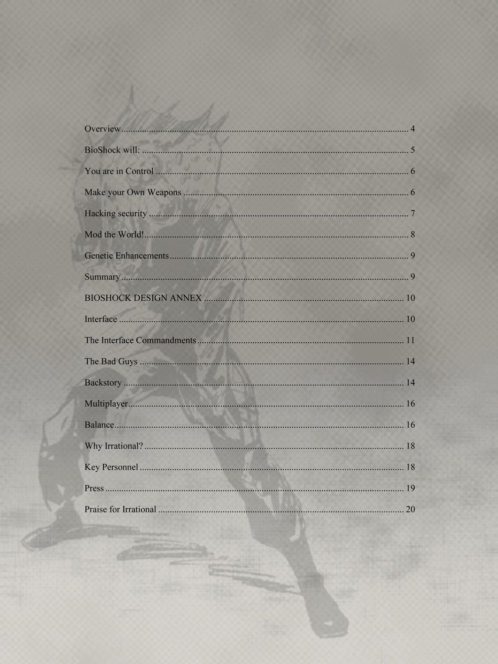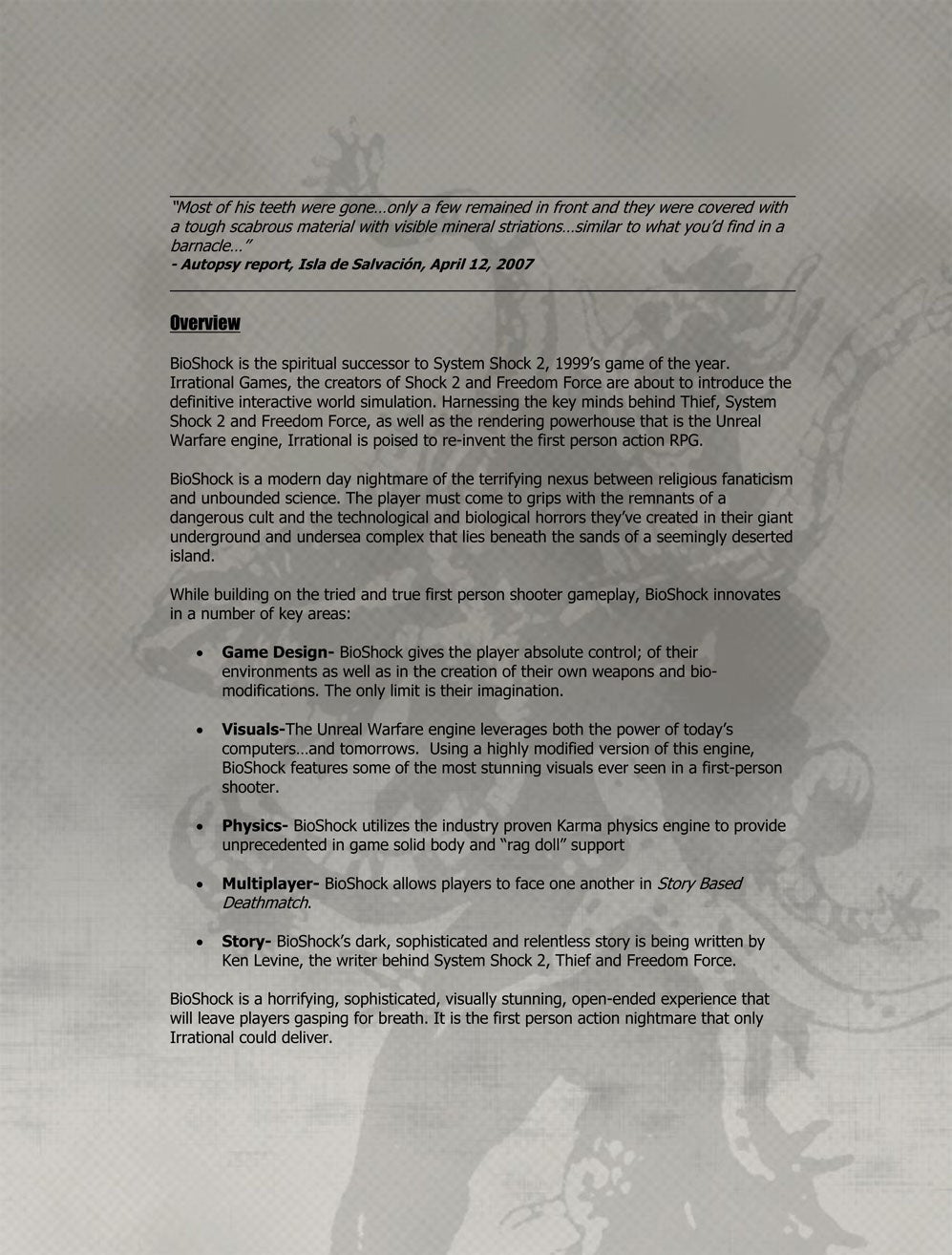 Irrational's first project was System Shock 2, a science-fiction horror title that pioneered a number of new techniques in interactive storytelling, which the team co-created with their former colleagues at Looking Glass. The year after System Shock 2's release, Levine sent a two-page pitch for a sequel to publisher Electronic Arts. The document was bare bones, describing how the previous game's cliff-hanger would be resolved. EA rejected the idea, most likely because, while System Shock 2 was a critical success, it was also a commercial failure.