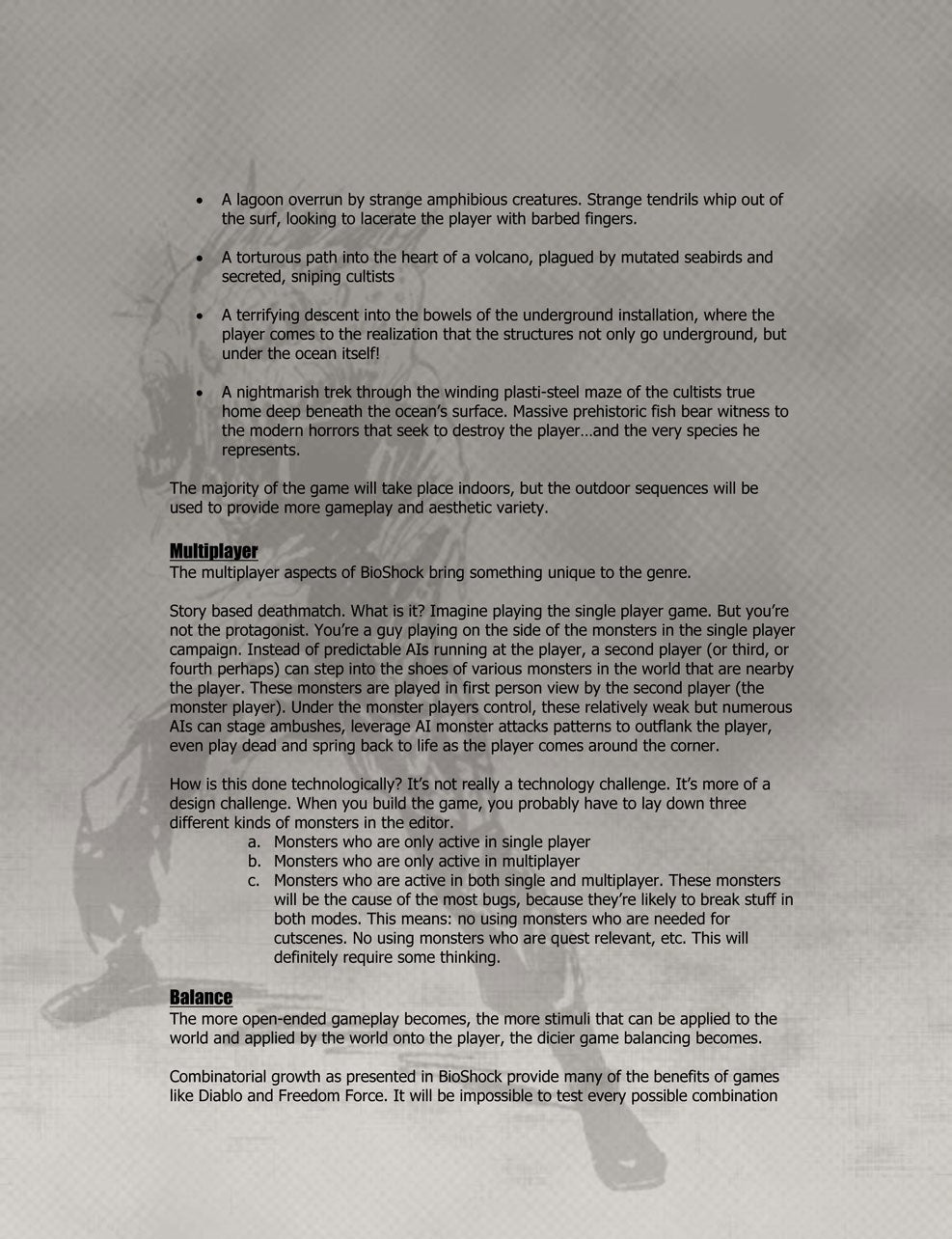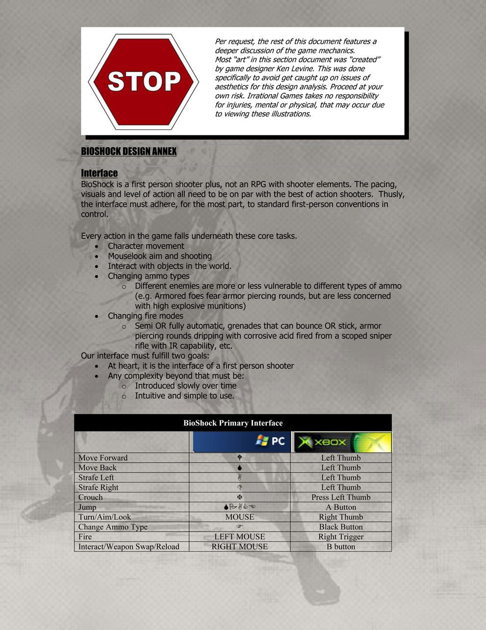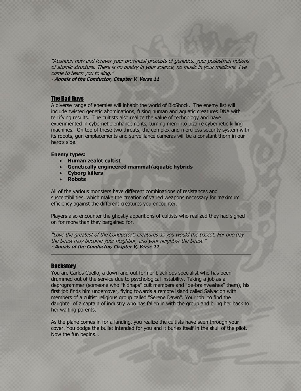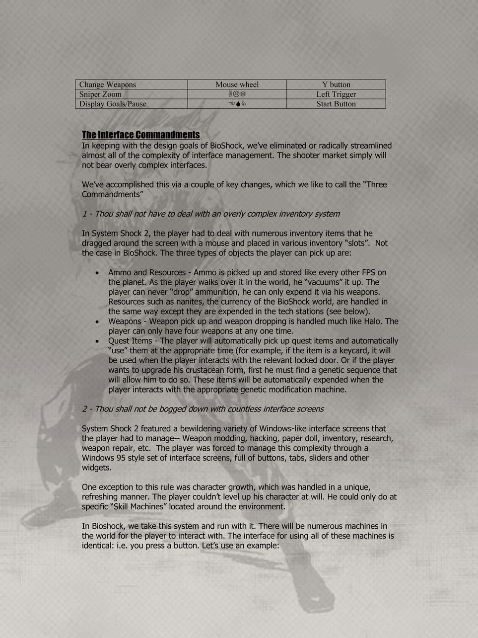 While Irrational continued to work on other projects - Deep Cover, a cancelled game made in conjunction with Looking Glass, Freedom Force and The Lost, a game that was completed but never released due to legal complications - Levine wanted to return to System Shock's freeform, immersive style of narrative.