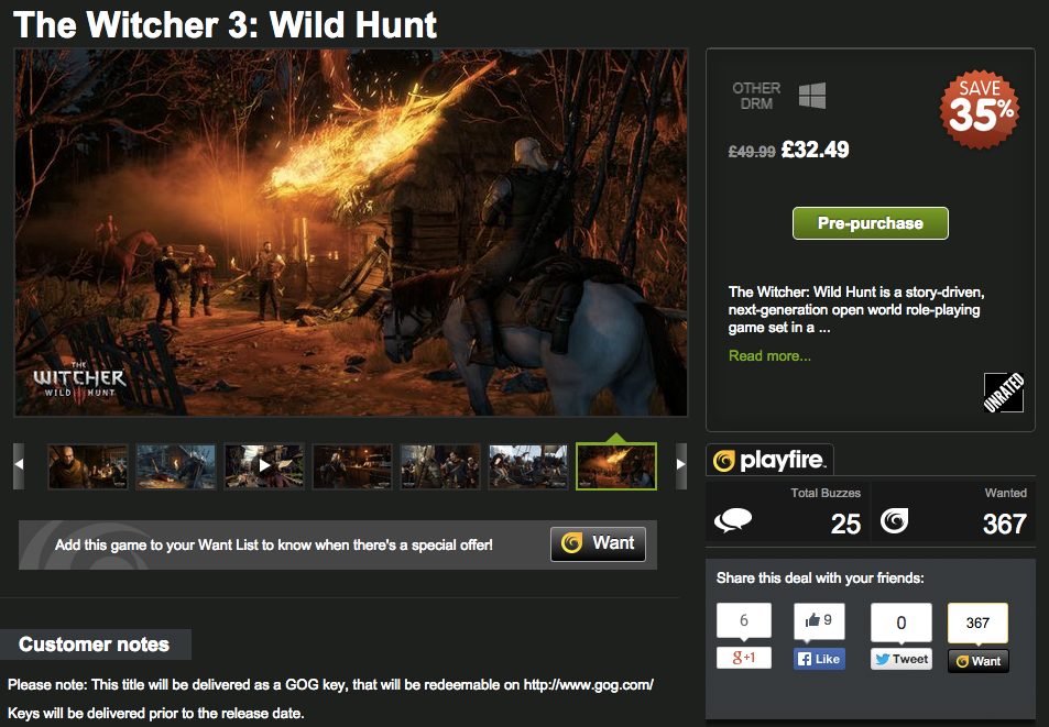 We at GMG sincerely believe in getting games to gamers, and offering them a range of buying options to suit their preferences is critically important to this industry; we often go above corporate profits and commercial gain to make this happen. We, like millions of customers, are huge fans of The Witcher series, and have been eager for the launch of this amazing title. We believe that CDPR's desire to support their own platform by working with retail outlets that would not conflict with their own is greater than that of meeting the demands of their audience, therefore we made the decision to indirectly secure the product and deliver it to our customers. To do this, we reached out to third parties and retailers that were approved by CDPR, to legitimately pass these keys onto our customers. This means that at some point, revenue has been passed directly onto CDPR, and any additional discount on the title is absorbed by us, as we want as many people enjoying The Witcher 3 as possible.