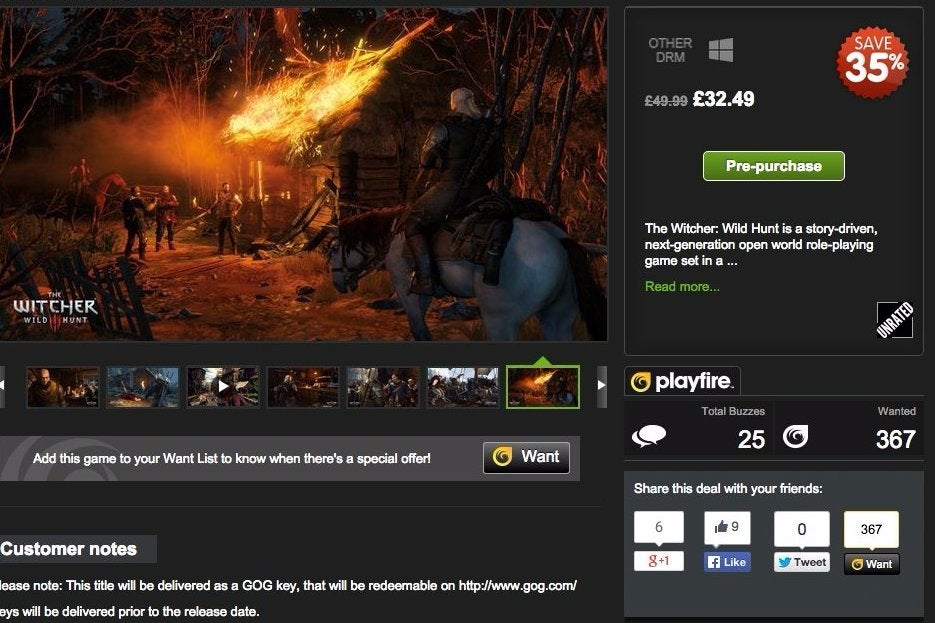 UPDATE 07/05/2015 8pm: Green Man Gaming has ended its Witcher 3 pre-order promotion, though it noted that it will "reinvigorate the offer in the run up to launch".