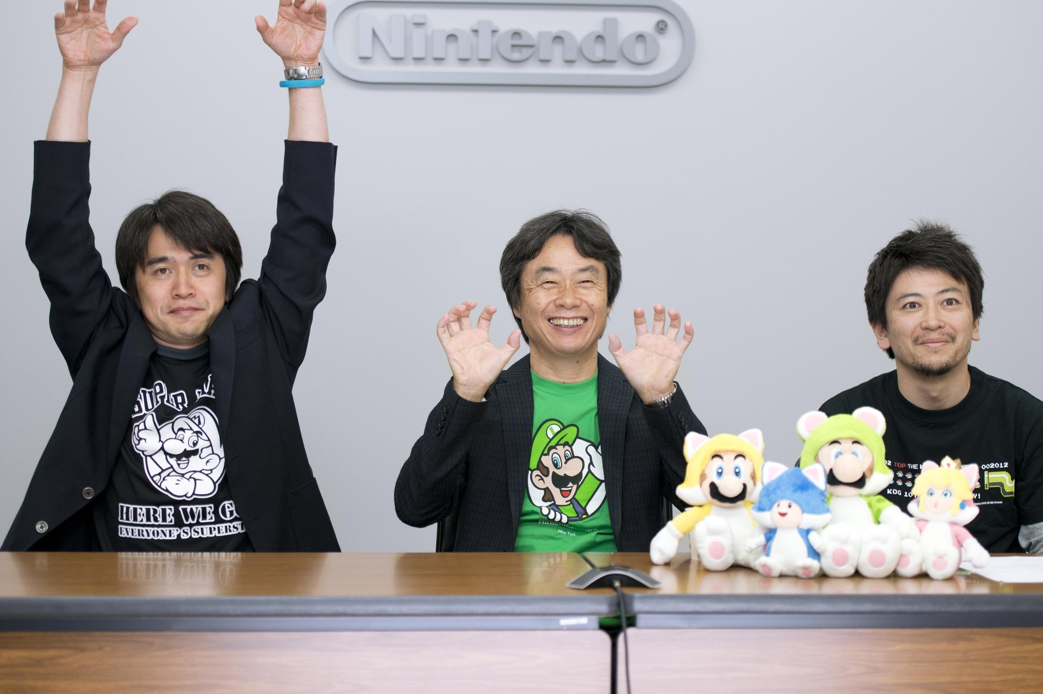On this cold October morning, the German sky a unanimous grey, Super Mario 3D World has inspired additional transparency for the curious. A handful of journalists have been invited to Nintendo's Frankfurt headquarters for a video conference call with Miyamoto, the game's producer Yoshiaki Koizumi and its director Kenta Motokura. The three men - without whom it is unlikely that Nintendo would exist in anything like its current form (and without anything like its enviable reputation) - sit coyly in a formal line-up in Nintendo EAD's offices, peeking over the fuzzy heads of three Mario plushies which smile unblinkingly from within cat costumes.