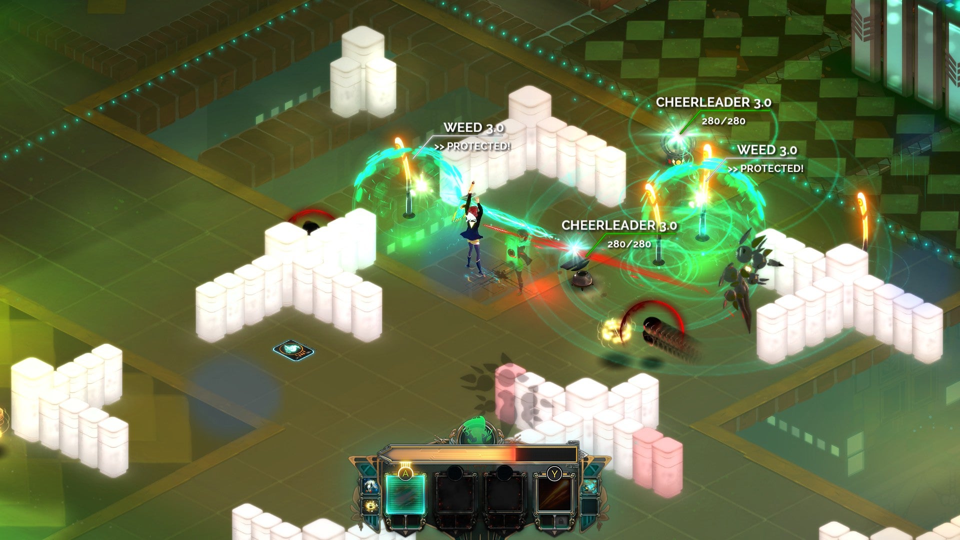 Ideally, you'll want to dash in, strike, and then dash away again so you can hide as your turn recharges and you're left unable to defend yourself. That isn't always possible, though, particularly when the enemies tend to arrive in clever congregations. Ranging from Weeds, plastic tendrils with an area attack and heal, and Cheerleaders, little satellite dishes which can lay down shields, all the way through to the lumbering Jerks and the teleporting Youngladies, Transistor's menagerie of foes are designed to work together, buffing, repairing, and even flanking. As with Bastion, it's not particularly hard to win a fight, but it's hard to win with flair.