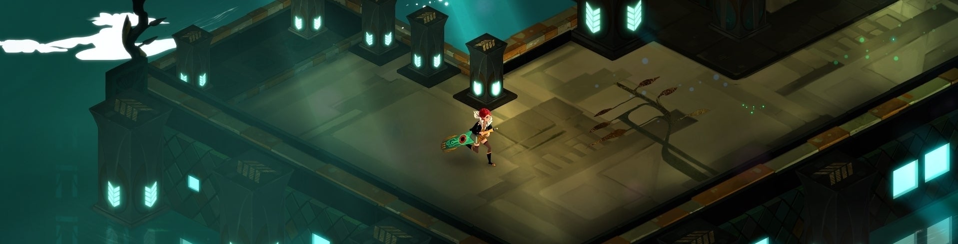 Technology never looked quite like this, mind. Transistor's world is a glorious, and gloriously confident creation. Brass and stained glass curlicues draw your eyes across isometric battlefields filled with dreamland skyscrapers; at times, the glittering urban sprawl seems to be viewed through a lens smeared with fingerprints. Cloudbank feels like a town inside an old perfume bottle, and Red's an arresting lead. She's both wilful and vulnerable as she drags her massive sword into battle, the tip sending up sparks as it races over the ground. Her enemies range from the Jony Ive turrets and greyhounds of the Process to the Schiele-like aristocrats, all bruised cheekbones and arthritic knuckles, who make up the crew pulling the strings.