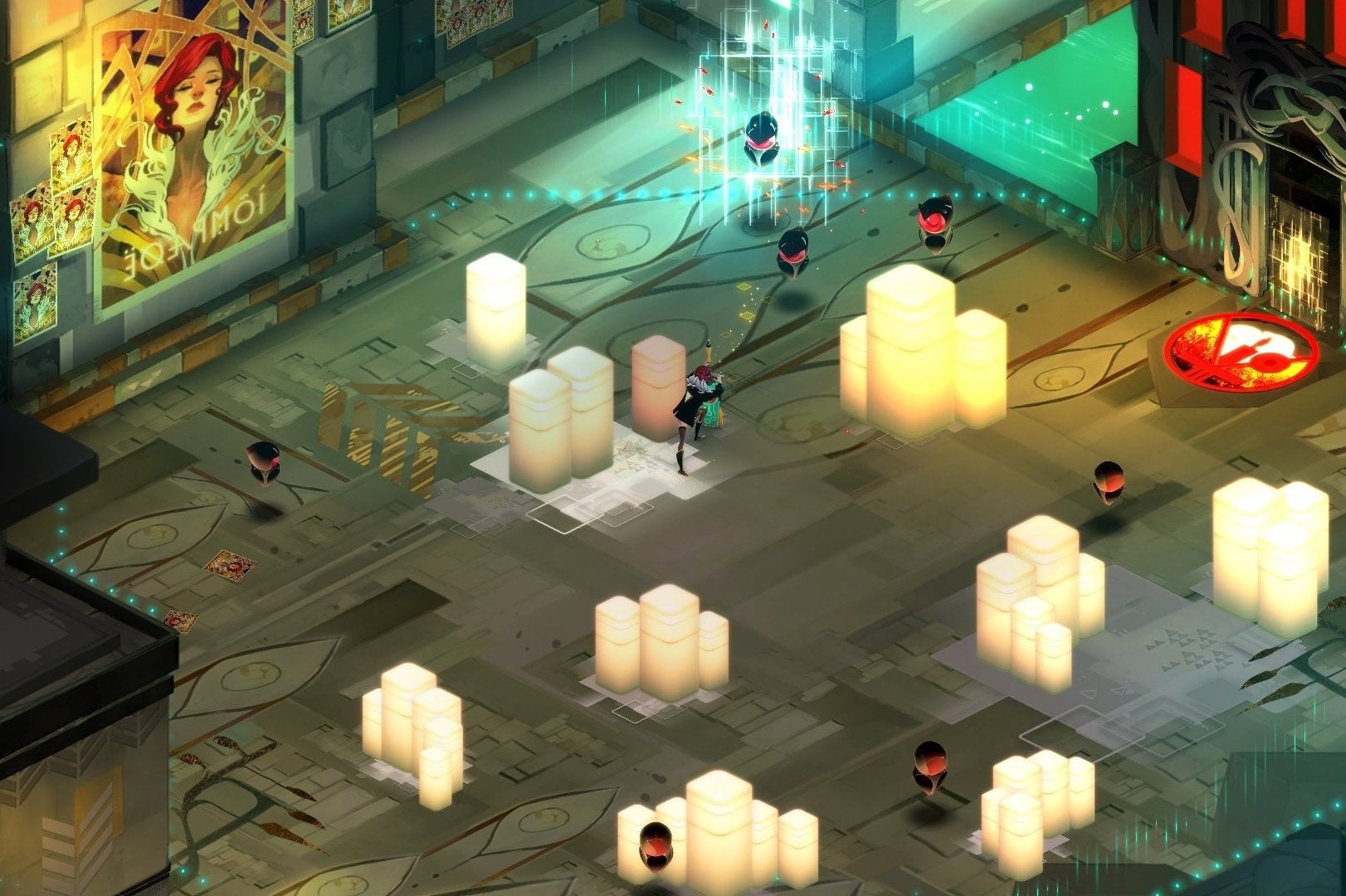 If Tron had been directed by Klimt or Mucha, it might feel like this. Beneath the looping drums and fuzzy guitars of Darren Korb's wonderfully distanced soundtrack, Transistor's city is Art Nouveau circuitry inlaid with gold leaf and reflective marble and filled with short journeys and bustling connections. Nursing her stolen voice and that talking sword, Red's battling to save this delicate metropolis from a shadowy organisation and a kind of cybernetic parasite called the Process, now busy racing around deleting entire neighbourhoods. A lot of what follows still refuses to untangle itself: as far as I can tell, Transistor seems pretty agitated by the distractions, homogenisation, and faux democracy of social media and perhaps by the strange power of celebrity. It's so varied and complex in its fixations that the whole thing can only be the material from someone's favourite dinner party spiel.