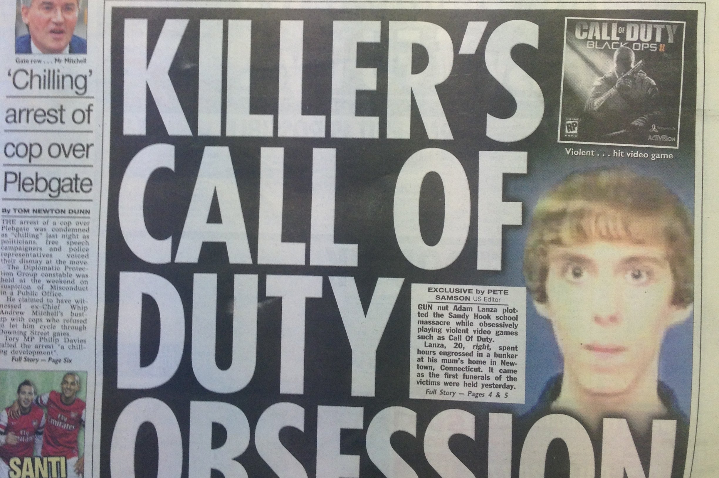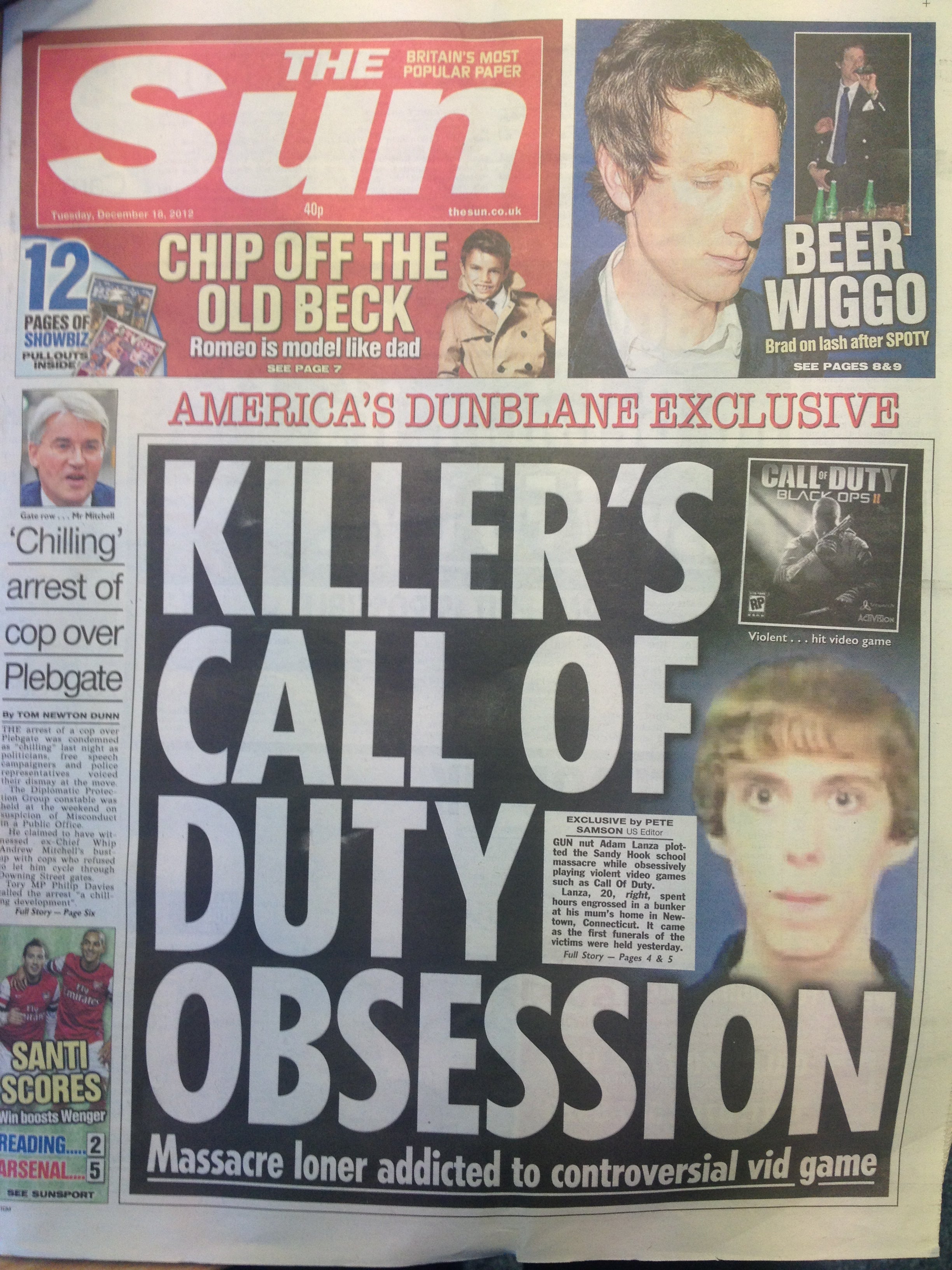 This morning's edition of The Sun carries the front page splash: “KILLER'S CALL OF DUTY OBSESSION”, saying Adam Lanza, who took his own life after murdering 20 children at Sandy Hook, was “addicted to controversial vid game”.