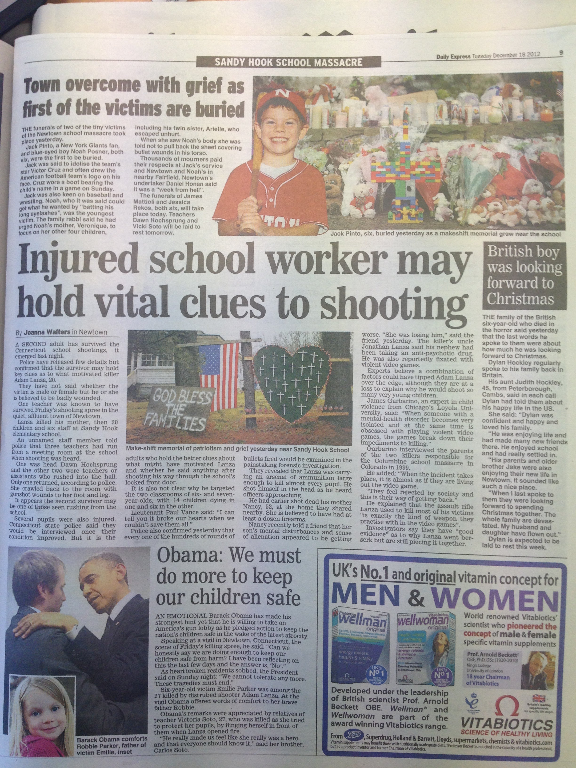 In today's edition The Daily Express again mentions video games. “The killer's uncle Jonathan Lanza said his nephew had been taking an anti-psychotic drug,” it says. “He was also reportedly fixated with violent video games.”