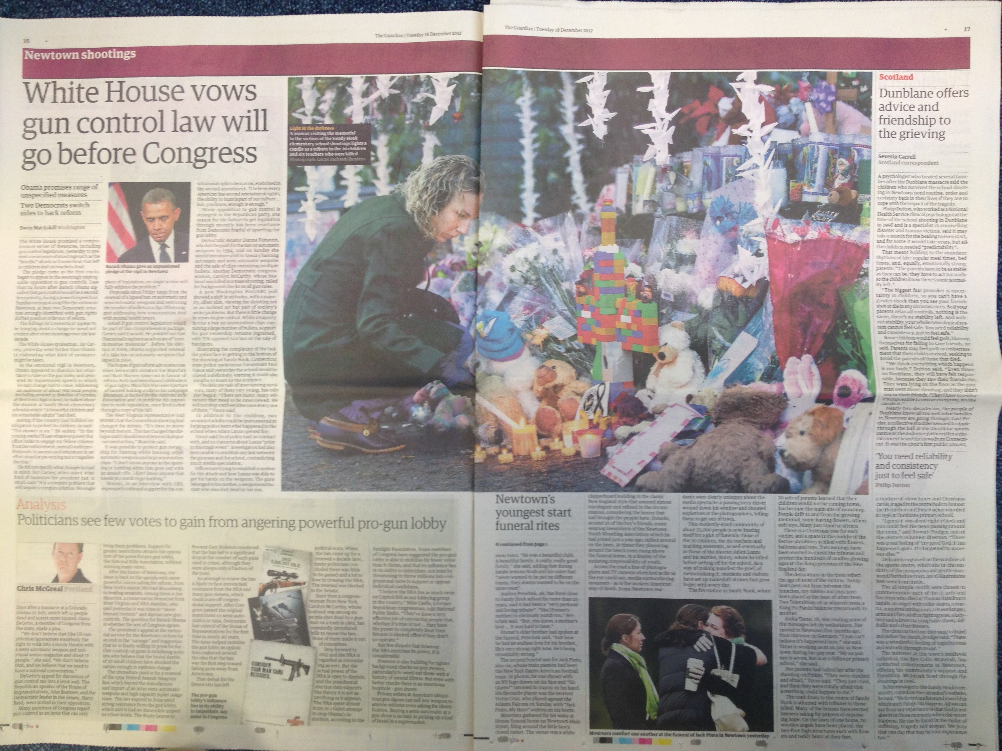 This morning's Guardian chooses to focus on the debate about gun control in the US in a double page spread. The Times' front page carries the headline: "Americans start to question gun laws". Inside is a report on US gun ownership.