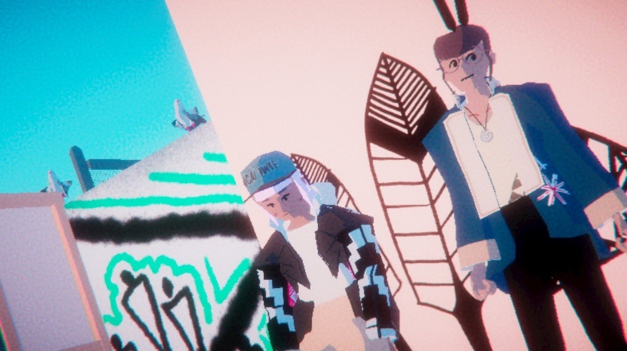 Umurangi Generation is a game about an awful lot of things beyond taking photographs - I am going to have to be selective here. One of the things it's about is the point at which two worlds intersect. The place you're dropped into in order to get your photos is Tauranga, Aotearoa, in the grip of a great crisis. The crisis is the stuff of sci-fi, and I won't spoil it because a lot of the game revolves around teasing it out. But I will say that like so much sci-fi it's in there to channel stuff that is very real and very topical. Tauranga itself is seen from the perspective of young punks and skaters - a friendly, artsy domestic scrabble of marker pens and spray cans, ramps and tape decks and intricate graffiti designs.