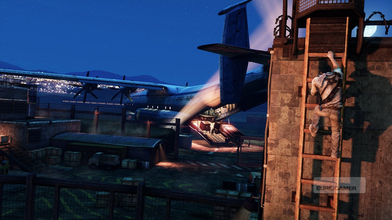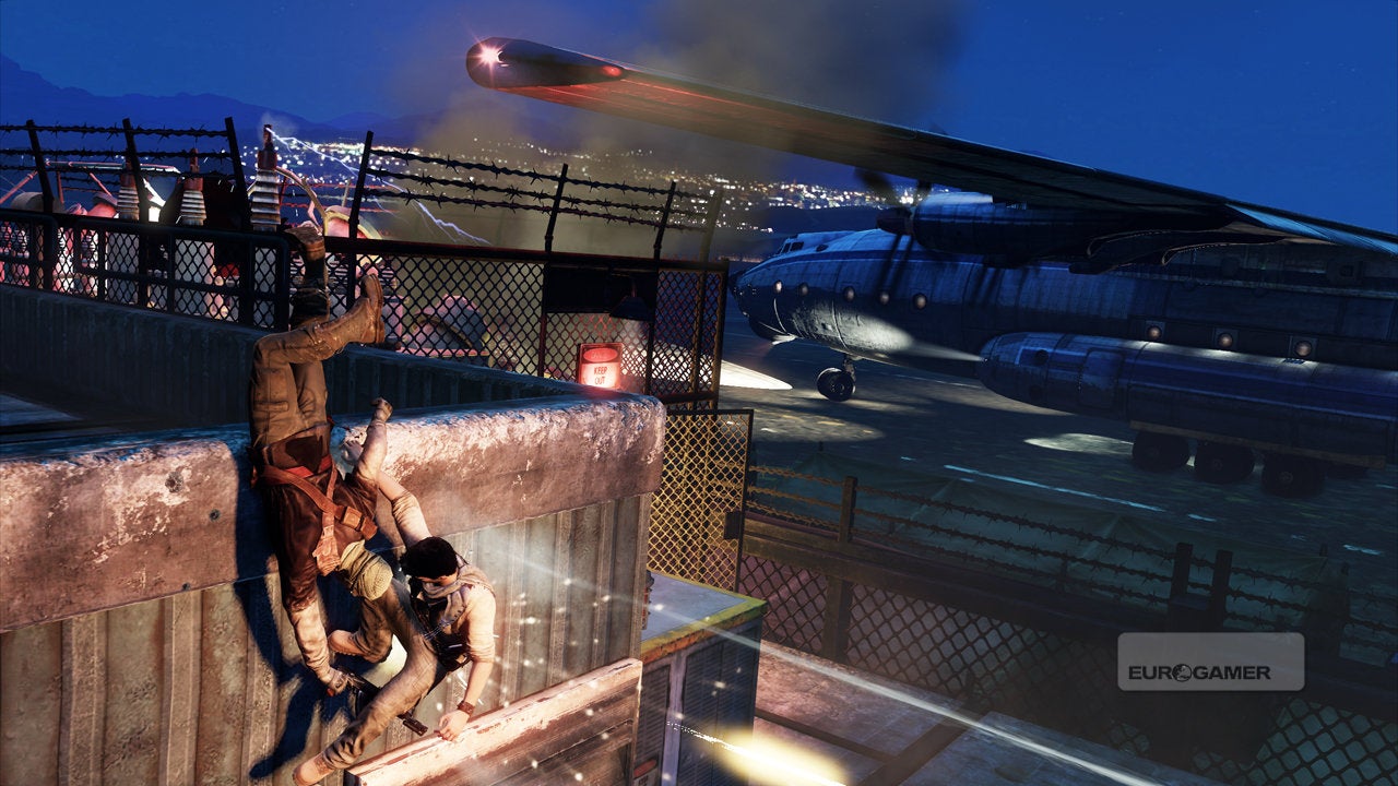 And Action. Nathan Drake, a blur of khaki and stubble, leaps from what must be the fiftieth rooftop high above the bustling streets of Yemen in pursuit of the be-suited villain. It's his sixth take ('life', in olde game parlance) in the most impressive chase yet seen in a video game, one directed with the kind of technical flair that wins Oscars. As he spills through a market stall, agitating chickens into a cloud of feathered squawks, the camera quick-pans to exaggerate the sense of kinetic drama.