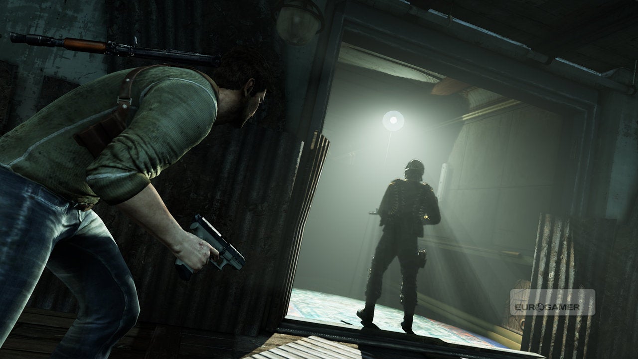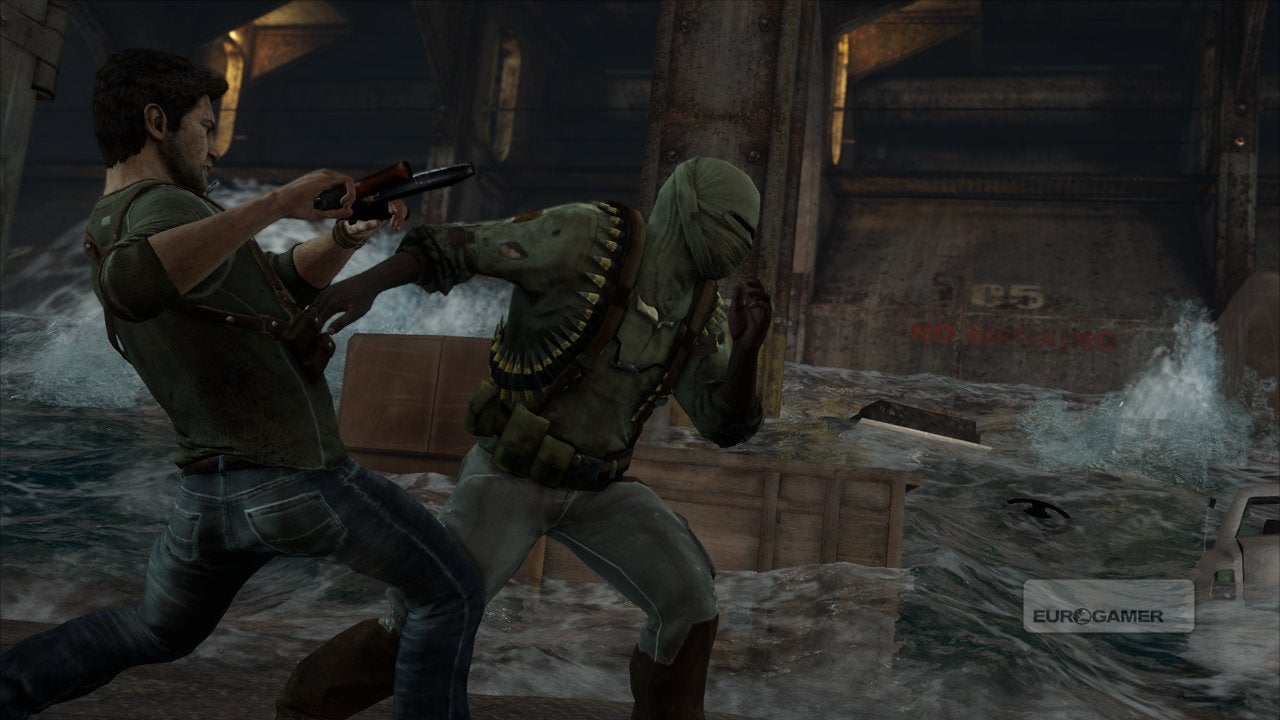 Frustratingly, you must always move at the script's pace. Enter a room with two giant cogs that need turning and Drake won't call over a comrade to help him until the correct sequence of cut-scenes has played out. The world is destructible, but only when Naughty Dog says so, and at times you cannot even un-holster Drake's gun, the developer simply disabling the button till the appropriate juncture. Oftentimes the game feels like a simple series of puzzles in which the puzzle is simply to locate the next trigger point for the drama.