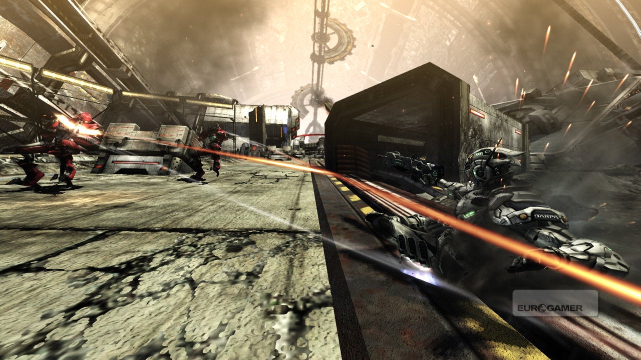 While in this high-speed slide it's possible to trigger the suit's bullet time mode, allowing you to pick out individual bullets and dodge between them. Bullet time is something we've seen before, but never with such grace as in Vanquish.