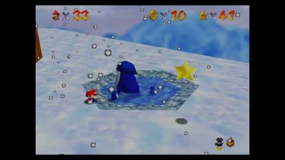Just because something is unnecessary does not mean it's unimportant. So much of Mario 64 is like that opening splash of the star man's face: almost incidental, or a joke, or used for a single star and then forgotten. Bop a koopa out of its shell and, rather than booting or grabbing it, Mario can now jump on top and start surfboarding. Cold, Cold Mountain has a mother penguin looking for her baby penguin at the bottom, and a bogus baby penguin right next to her. For the next star you race a Penguin down a slide and, if you take the secret route to guarantee a quick victory, it tells you off for cheating and withholds the prize. Cold, Cold Mountain itself, after Bob-Omb Battlefield and Whomp's Fortress, is about going downhill fast rather than climbing up. The nature of 3D space allows new illusions and surprises: a neverending staircase to nowhere, a level hidden within a ghost, a secret world found by looking at the sun. Tiny-Huge world has two entrance paintings, one tiny and one huge, and the one you choose dictates Mario's size in the level.