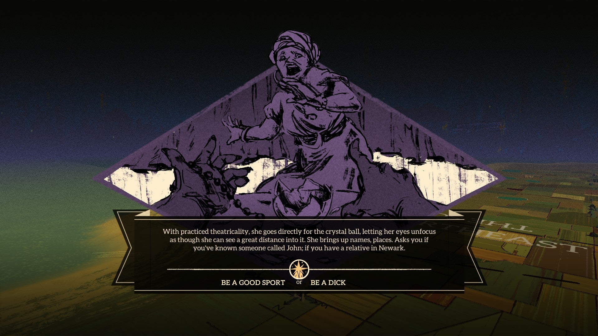 Whatever that choice, you'll tramp away with another nugget for your collection, and even the most humble encounter may flower into something grand over time - indeed, if you spread the story around, that's all but guaranteed. The game's literary inspirations run a wide and exhilarating gamut, from tragedy to comedy and classical realism to outright fantasy. There are grimy Steinbeckian portrayals of prejudice and want, thumbnail sketches of clashes at picket lines, farmyard accidents and backwoods eccentrics. There are stories that walk the line between the symbolic and the tangible in echo of Cormac McCarthy, using bare detail to tamp down descriptions of burning crowns and talking cats. There are even stories that borrow characters or motifs from other time periods - a Volkswagen minibus that seems a little too sophisticated for the era, its occupants shrouded in smoke.