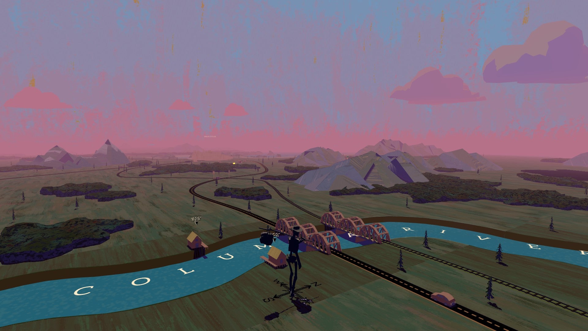 If the personalities are worth spending time with, the experience of walking the map gets a little dreary. I'm in love with the game's sky - a scraped and mottled expanse of blue and purple, like a water-damaged Rothko canvas - and the slowness of your progress through the hazy landscape makes each story you uncover feel like more of an event. Still, I did find myself tuning out after a while, and the uneven framerate makes me wonder whether another mode of exploration would have suited Dim Bulb's purposes better.