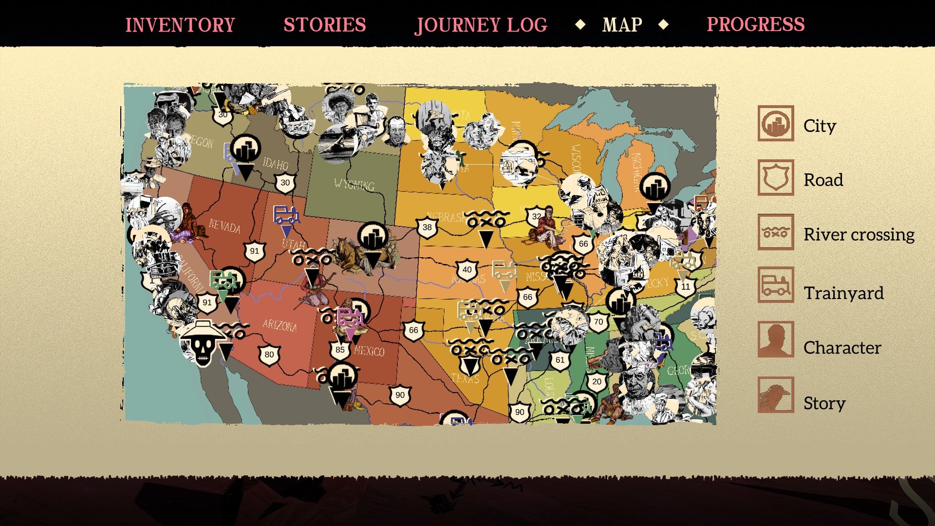 Some of the travelling mechanics are also a bit buggy. You can stretch out a thumb to hitchhike, but cars wouldn't let me board them once stopped (only sensible, perhaps, given that you are a walking skeleton, but this never bothers any of the people you meet on foot). In theory, you can also hit control key to whistle along with the soundtrack and accelerate your pace, but this never seemed to actually work for me. The soundtrack is, at least, a pleasure to whistle along with, a medley of bluegrass, jazz and Mexican folk music that changes from state to state. Certain verses and structures carry over between tracks, reflecting how the stories you carry flow together into one grand and meandering narrative - indeed, the music is as much the soul of the game as its script.