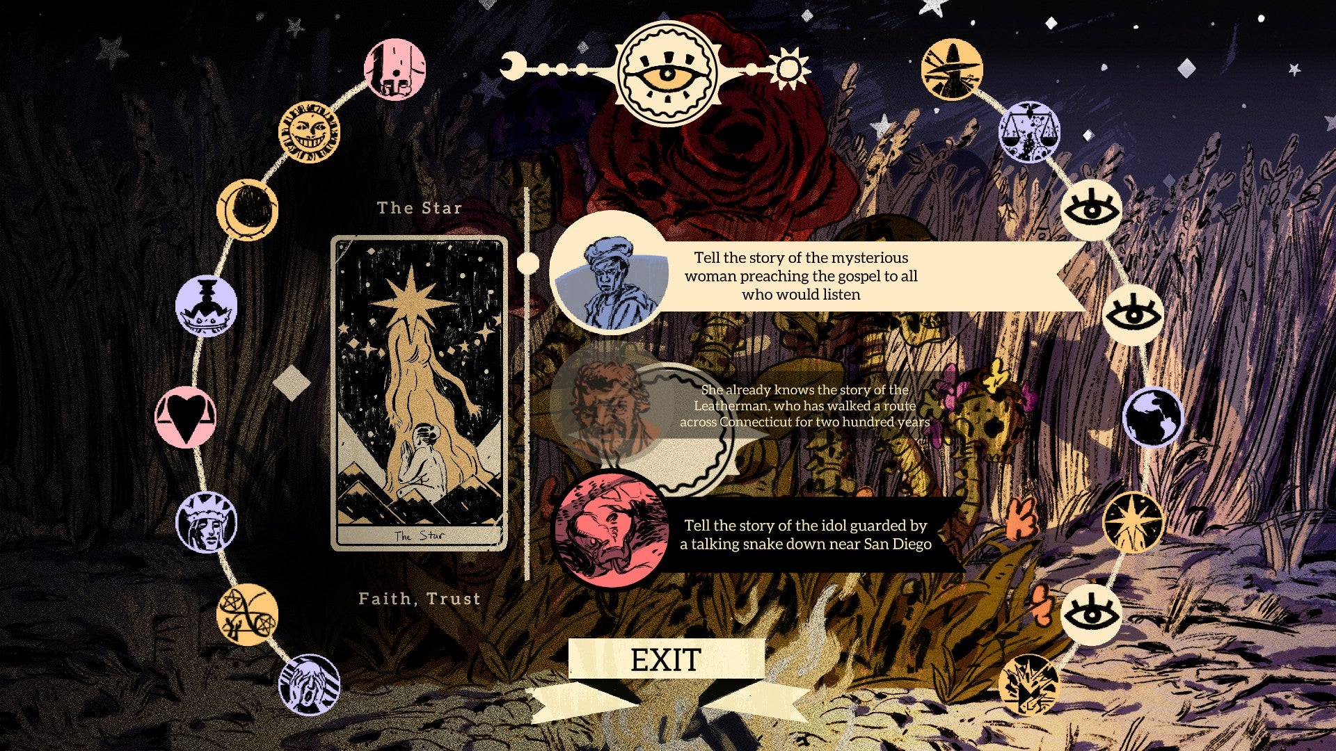 The campfire exchanges represent Where The Water Tastes Like Mine at its most challenging, though this is never a difficult game - fail to woo a fellow wanderer, and you can always try again when you next bump into them. Stories are divided into tarot suites, and you can have three active stories in your hand per suite, selected via the inventory screen. Once you've told a story the associated suite is locked off for the rest of the chat, so a bit of strategy is required: there's no sense prematurely killing off a suite that contains a juicy yarn, but you might be forced to by the listener's choice of topic.