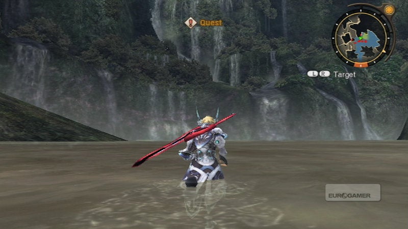 Its world is shaped like a giant colossus. Imagine one of Team Ico's giants had been blown up to a hundred times its original size and frozen in time, before reeds, trees and lakes were allowed to settle on its features. The Bionis, as it is known, is the world upon which you adventure, its 10-mile limbs the walkways and bridges you clamber across. Exploration off the beaten track is encouraged with experience point rewards for every landmark charted - but this is a world that invites wide-eyed surveying. The joy of discovery is reward enough.